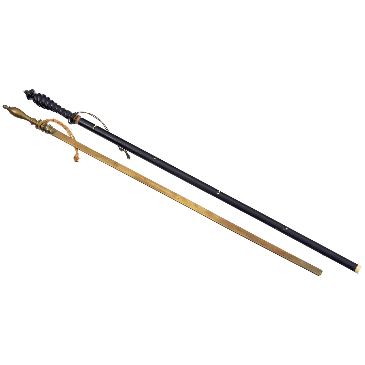 1) Round ebony stick, delineated with bone nails, turned handle on the side, length 29 1/2 in. - And: 2) Brass, flat form, stamped markings, length 28 in.