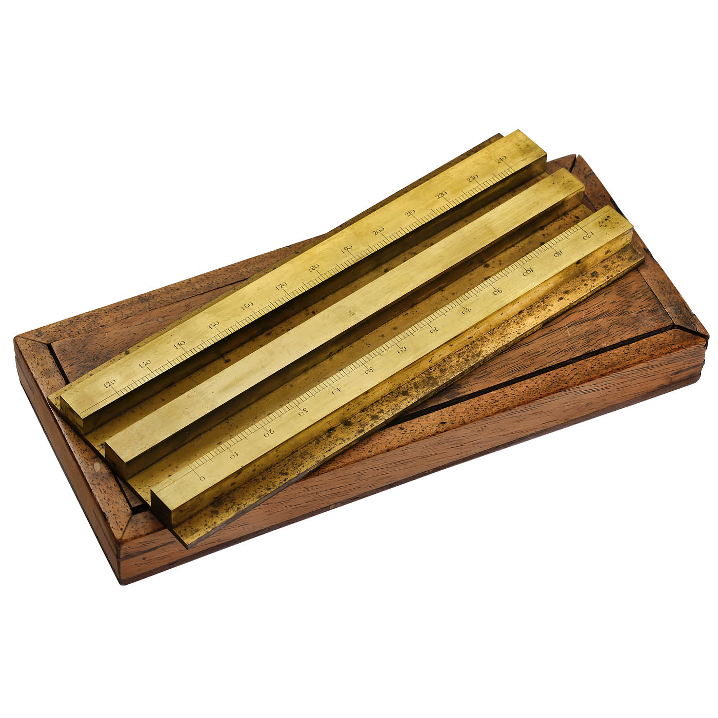 Colombi, Optician de la Marine, Brest, France. Brass measuring instrument with tapered troughs, used to determine pottery kiln temperature, calibrated scales 0-240, housed in the original walnut case with early label on base.