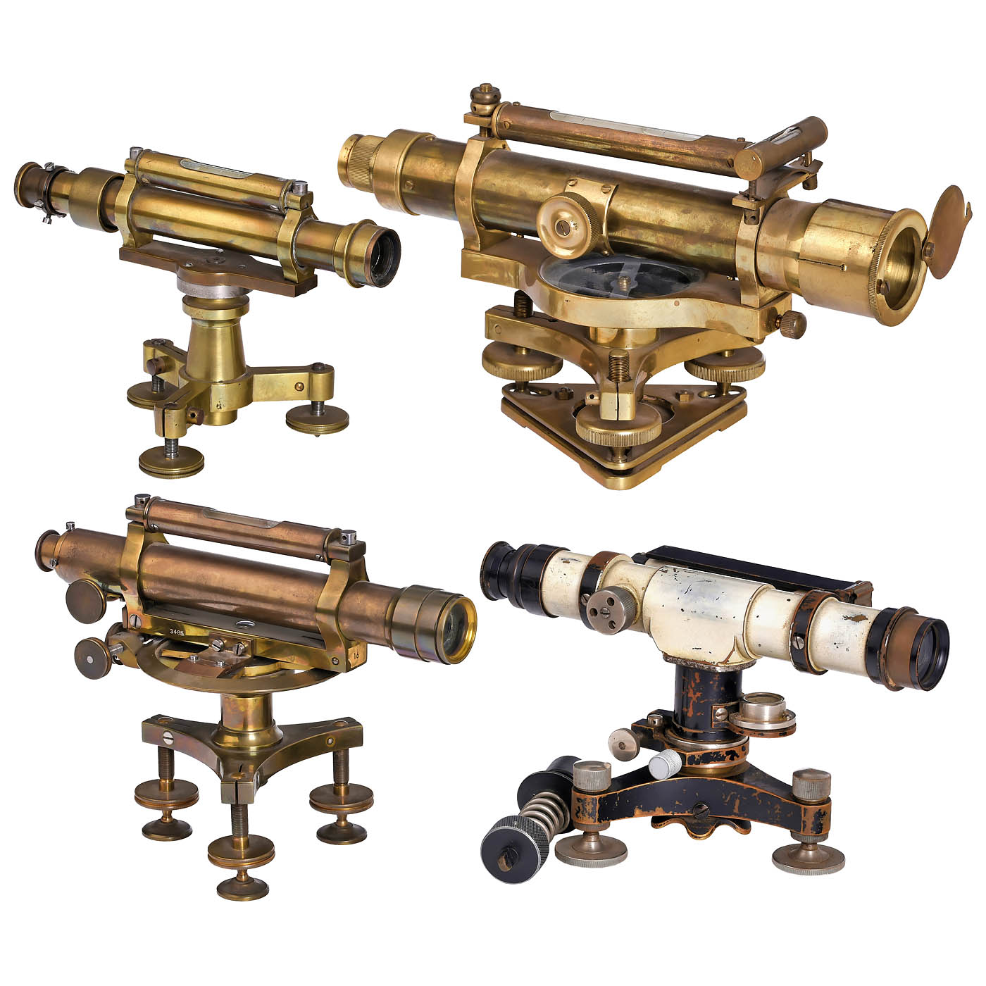 1) Level by R. Reiss, Liebenwerda, c. 1890, serial no. 3485, polished brass, azimuth graduation, spirit level, rack-and-pinion focusing, telescope length 9 ¼ in., 3-foot mount. - 2) English level by Watts & Sons Ltd., London, no. 89945, polished brass, telescope length 11 ½ in., 2 spirit levels (one dry) and compass, in a wood case. - 3) Unmarked, polished brass, 1 spirit level, telescope length 7 4/5 in., in a wood case. - And: 4) Ertel-Werke, Munich, c. 1920, model 713, 24x magnification, lacquered brass, with 1 circular and 1 stick level, telescope length 9 ½ in., removable tripod, in a wood case.