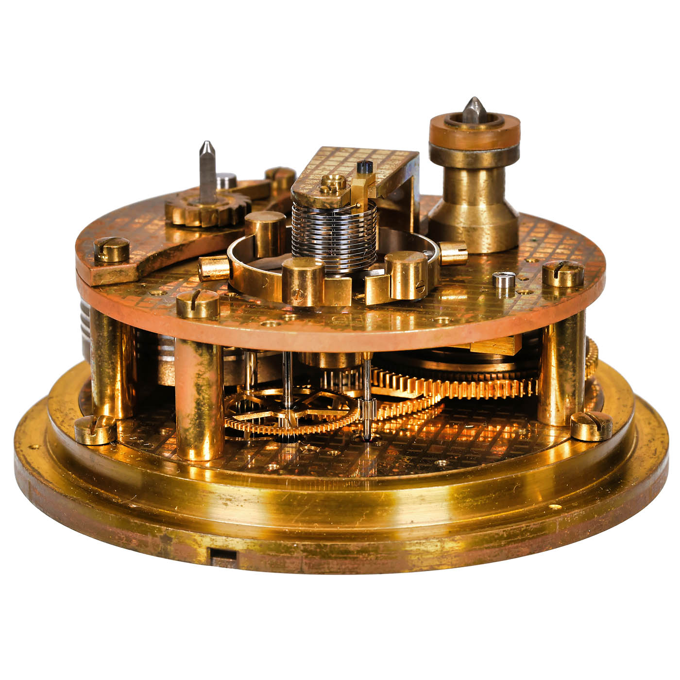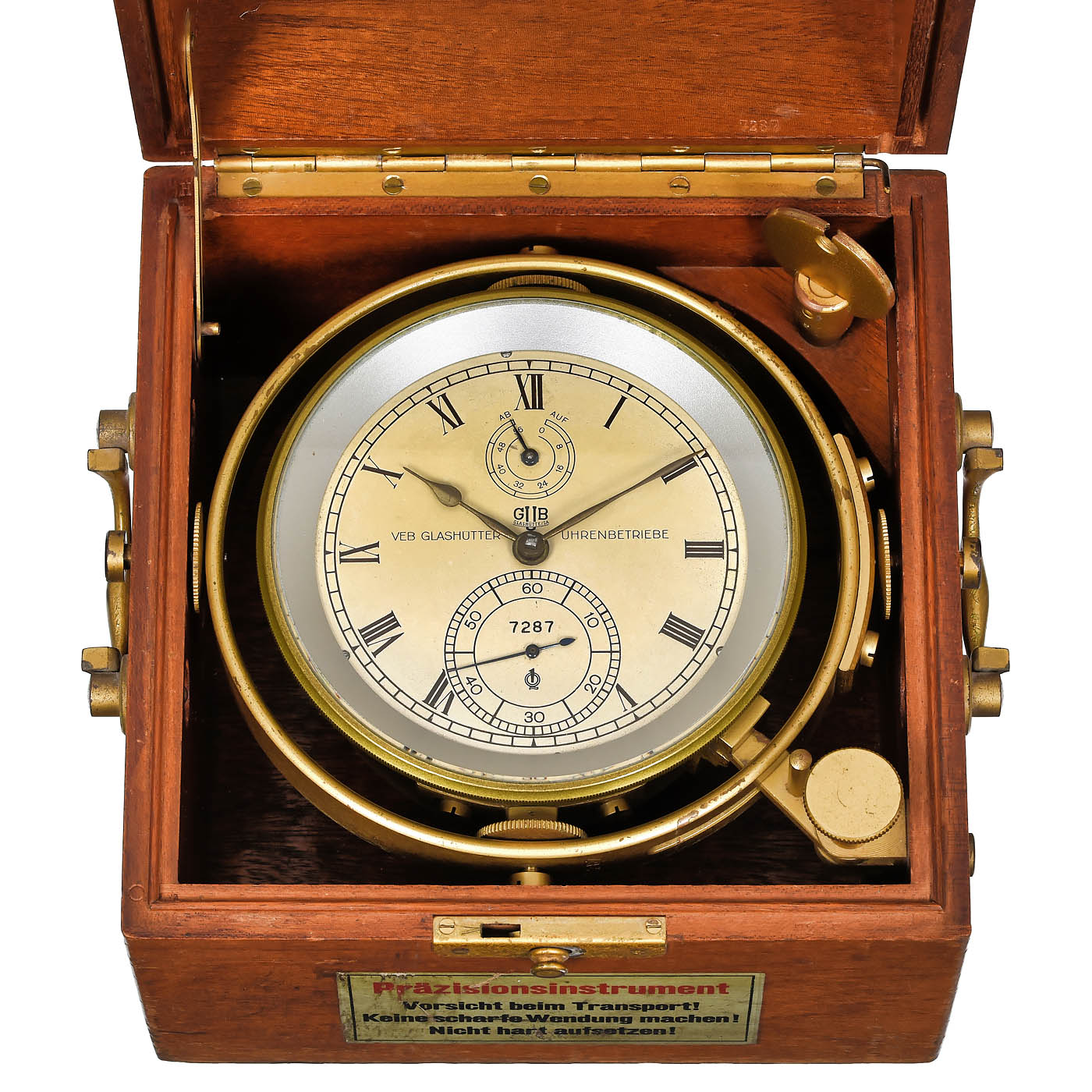 GUB VEB Glashütter Uhrenbetriebe, Glashütte, Saxony, Germany. Calibre 100, serial no. 7287, in brass gimbal in fitted two-tier mahogany box, fusee-and-chain movement, with seconds dial and up-and-down dial for 56 hours, with key, working. The company "GUB" was the nationalised direct successor to A. Lange & Söhne. This chronometer is marked with the GDR's "Q" quality mark reserved for the company’s top-of-the-range products.