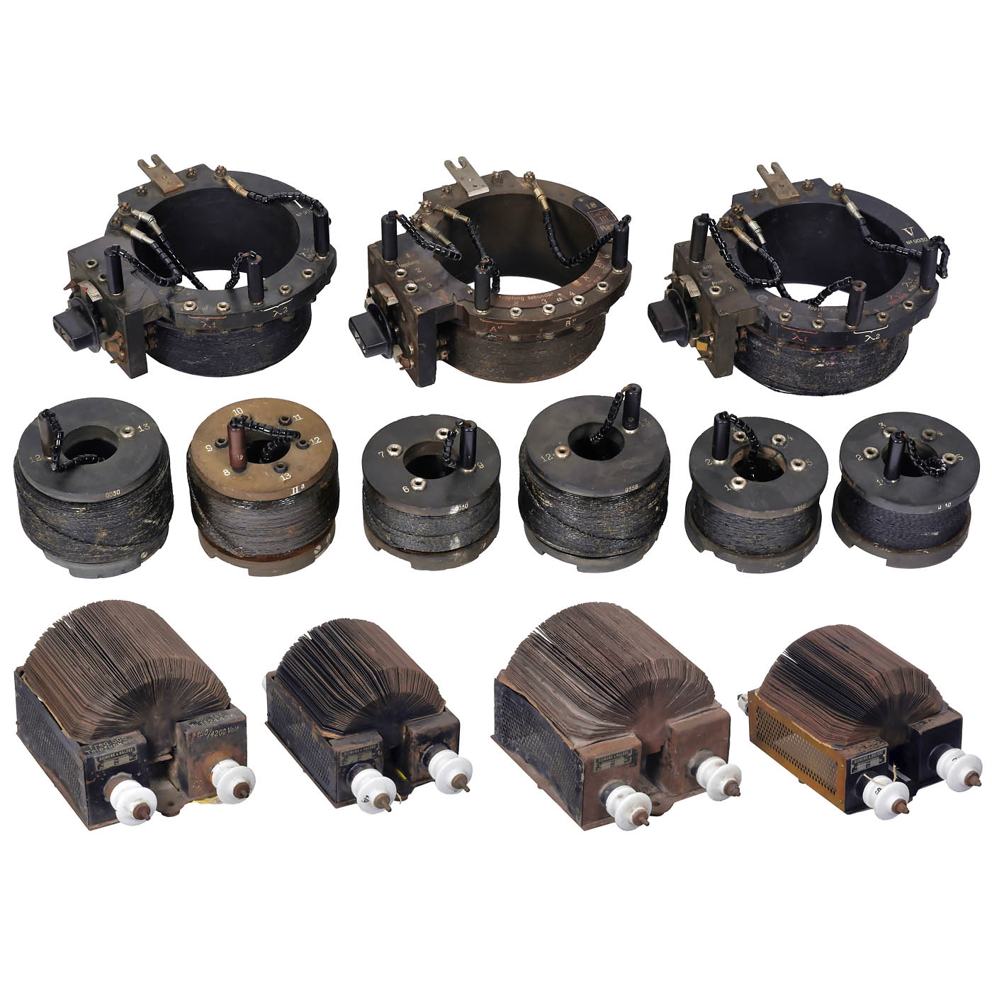 1) TK 05 transmitter system, 0.5 kW aerial energy, for 3 fixed waves from 300 to 600 meters, with extinguishing spark gap, antenna ammeter by Siemens & Halske and copper tape coil for tapping the working frequencies. This type of transmitter was used on medium-sized passenger steamers and shore stations. - 2) Primary and secondary receiver E5c, 2 plugged detector crystals, change-over switch to operate one transmitter on a common antenna, with 4 replaceable coils, one coil and a porcelain insulator damaged. - 3) Sound controller, portable with handle, for transmitter testing. - 4) 8 porcelain insulators. - 5) 4 voltage transformers by Siemens & Halske. - 6) 2 variometers, copper tape, one with 2 coils, the other with 3 coils. - 7) Extinguishing spark gap, two-part, with cooling, porcelain insulators, in cast frame. - And: 8) Transformer, Siemens & Halske, primary 55/110 volts, secondary 4000 volts, 500 hertz.