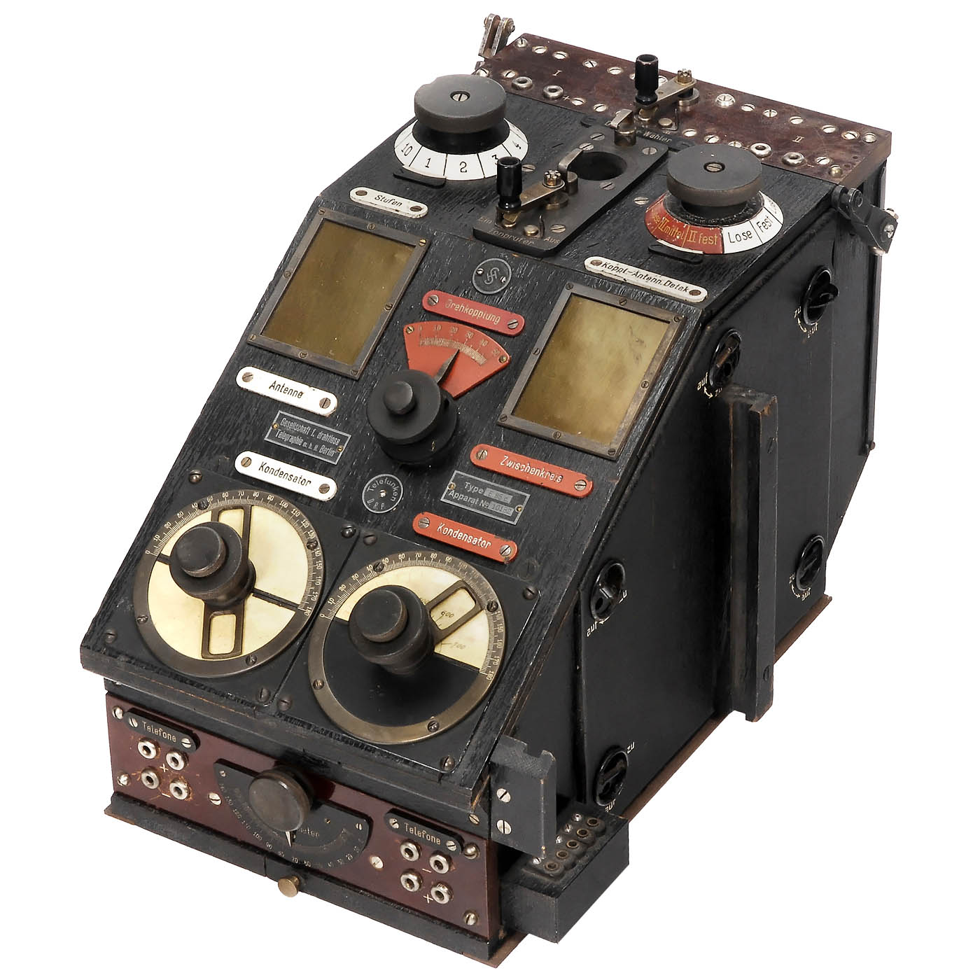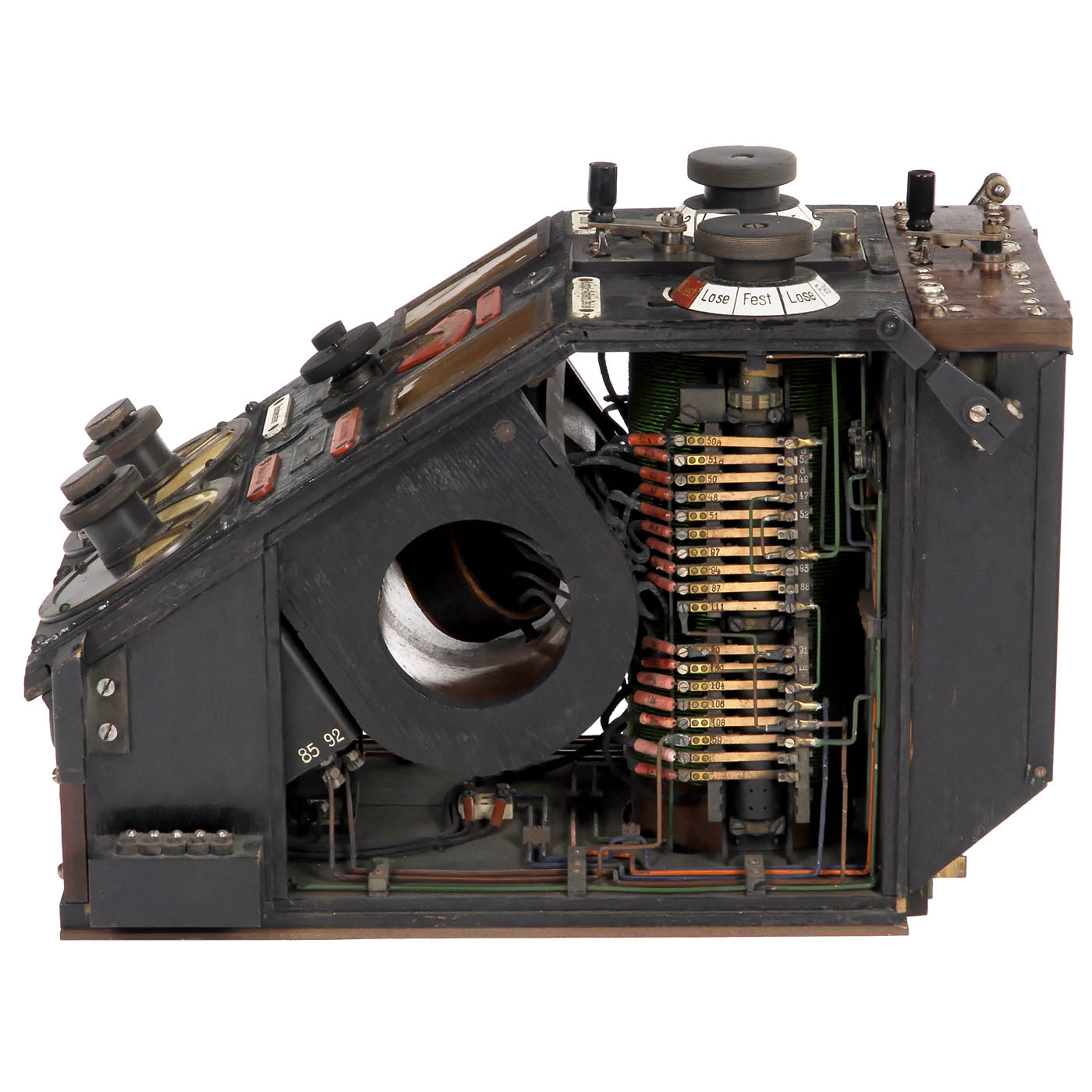 Gesellschaft für drahtlose Telegraphie, Berlin. No. 10182, primary/secondary receiver with numerous tuning possibilities, primary from 150 m to 6000 m, secondary from 150 m to 1800 m, for headphones or AF amplifier, desk-shaped wood case.