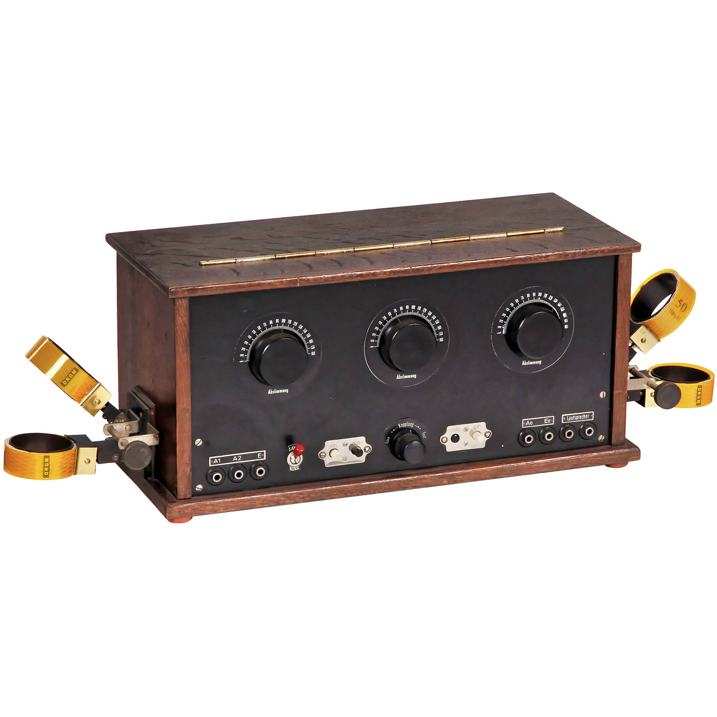 1) Loewe 2H3N radio receiver, c. 1928, remote receiver, Radiofrequenz GmbH, Berlin-Friedenau (later Loewe), 2 tubes, long wave and medium wave, battery-operated, for external loudspeaker, wood case with lid, complete with Loewe tubes 2HF and 3NF, bridge-coil couplers on both sides, battery cables, external power supply. - 2) Weltecho ERWW428, c. 1929, Lorenz, Berlin, 4 tubes, long wave and medium wave, battery-operated, for external loudspeaker, wood case with lid, complete with tubes and battery cable. - And: 3) Neutrodyne P4a, c. 1928, Nora, Berlin, 4 tubes, long wave and medium wave, battery-operated, for external speaker, with tubes and battery cable.