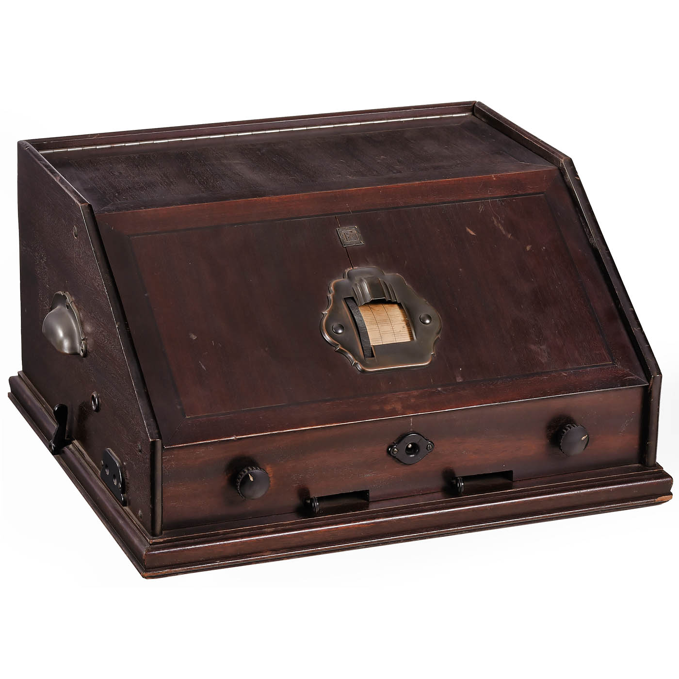 1) 6-tube receiver, mains-powered, MW and LW, for loudspeaker, desktop-style wood case, width 21 in. The most complex Telefunken radio from the 1920s. - And: 2) Arcophon 3, magnetic loudspeaker, system adjustable, with modulator to adjust the timbre for speech or music, oak cabinet, front and rear panel of embossed metal.