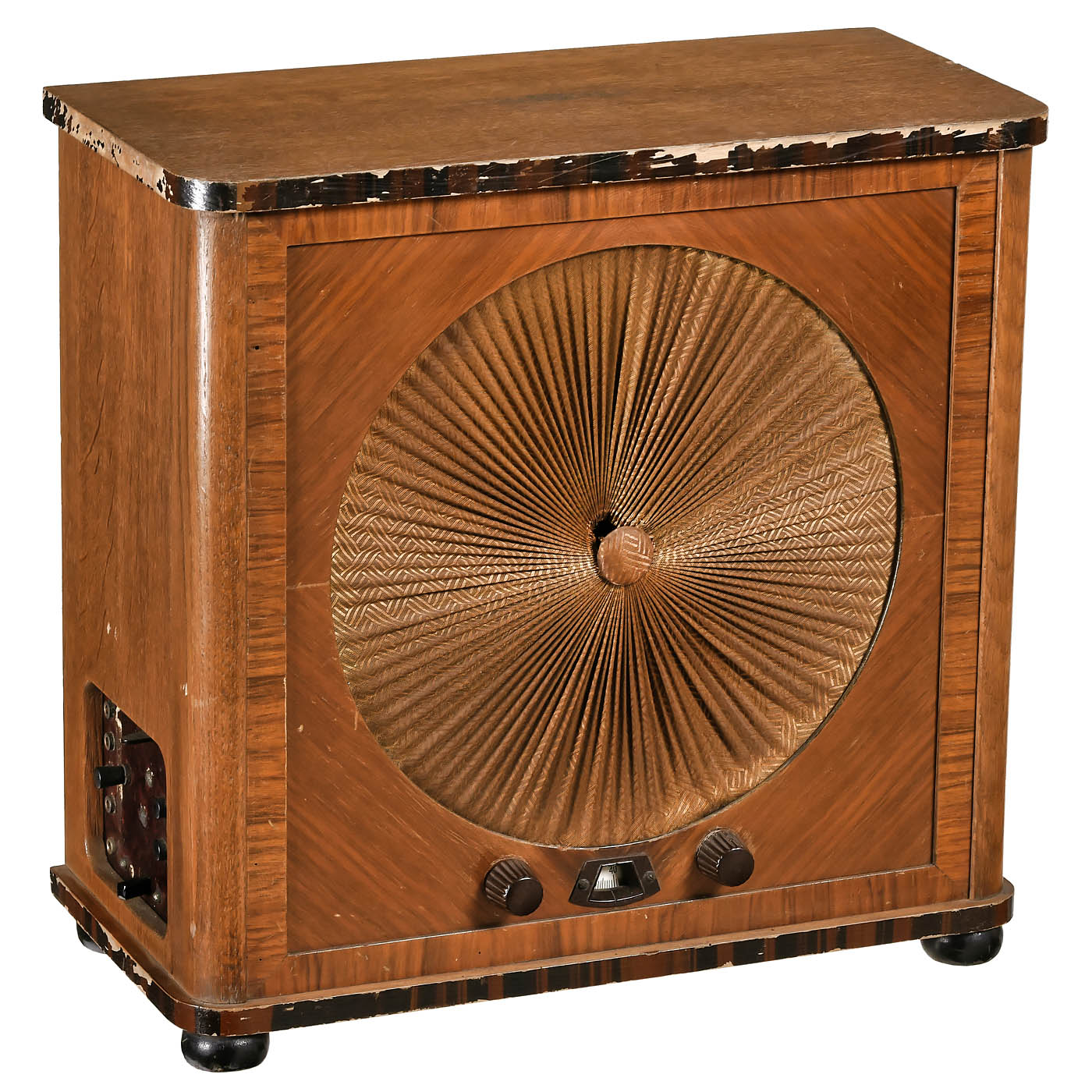 1) Loewe EB100W, c. 1930, Loewe-Opta, Germany, 2 tubes (3 NFW missing), 110 volts AC, long wave and medium wave, magnetic speaker, wood case. - 2) Federal model 141, c. 1925, Federal Telephone & Telegraph Co., Buffalo, 5 tubes, medium wave only, battery-operated, for external speaker, wood case with 2 doors. - 3) Saba model 31W, c. 1931, Schwer & Söhne, Villingen, Germany, 4 tubes, long wave and medium wave, 110-220 volts AC, for external loudspeaker, bakelite case. - 4) Nora Reise-Super K69, c. 1939, Berlin, 6 tubes, long wave, medium wave and short wave, battery-operated, dynamic loudspeaker, wood case with imitation leather cover. - And: 5) PE 38 record player, c. 1938, Perpetuum-Ebner, Black Forest, Germany, 110-220 volts AC, for 78 rpm records up to 12 in. diameter, wood case.