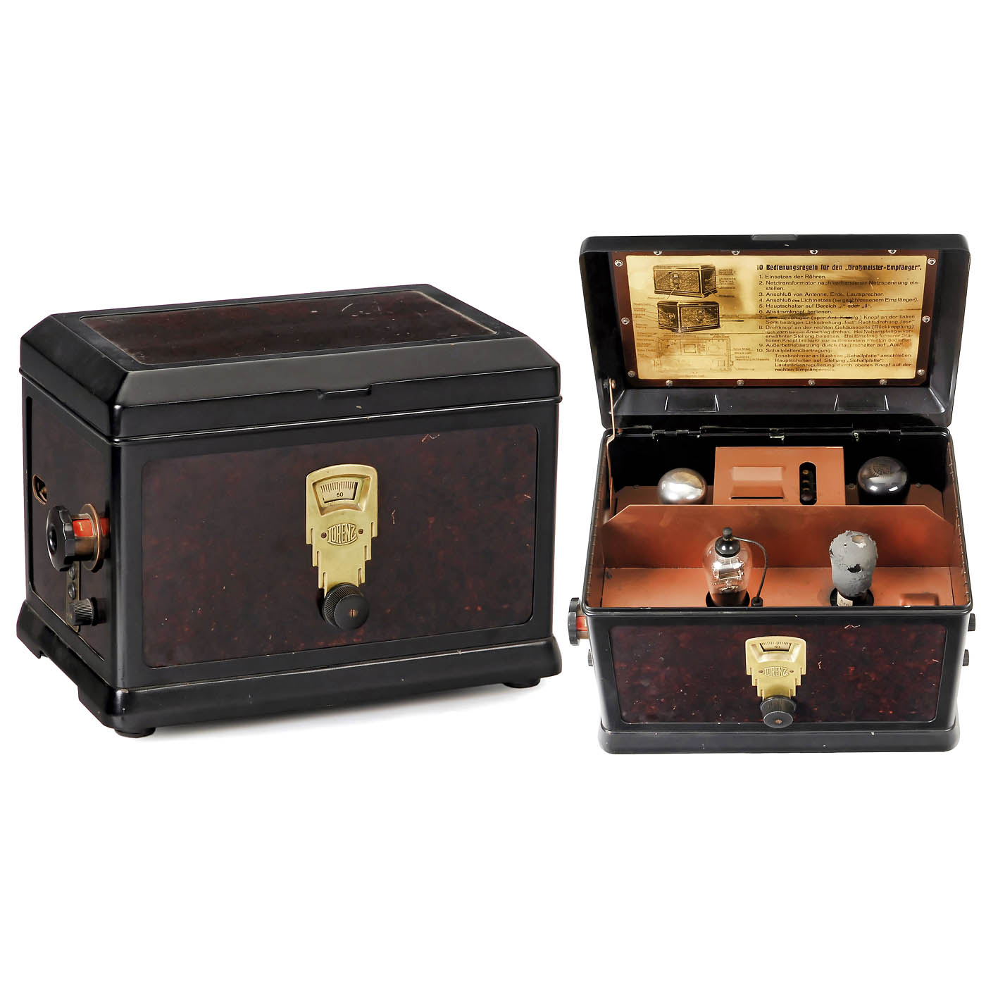 1) Grossmeister EKrE330W, c. 1930, Lorenz, Berlin, 4 tubes, long wave and medium wave, 110-220 volts AC, for headphones or LF amplifier, metal case, complete with tubes. - 2) Geadux 112 WL, c. 1933, AEG Berlin, 3 tubes, long wave, medium wave and short wave, 110-240 volts AC, dynamic loudspeaker, bakelite case, complete with tubes and rear panel. - 3) Rfe 27 30W, c. 1929, Siemens & Halske, Berlin, 4 tubes, long wave and medium wave, 220 volts AC, for external loudspeaker, wood case, complete with tubes. - 4) Lumophon W 100, c. 1930, Bruckner & Stark, Nuremberg, 5 tubes, long wave and medium wave, 110-220 volts AC, for external loudspeaker, wood case, complete with tubes. - 5) S4W, c. 1931, Nora, Berlin, 5 tubes, long wave and medium wave, 110-240 volts AC, for external speaker, wood case, complete with tubes. - And: 6) 31, c. 1931, Dr. Georg Seibt, Berlin, 4 tubes, long wave and medium wave, 125-220 volts AC, for external loudspeaker, wood case, complete with tubes.