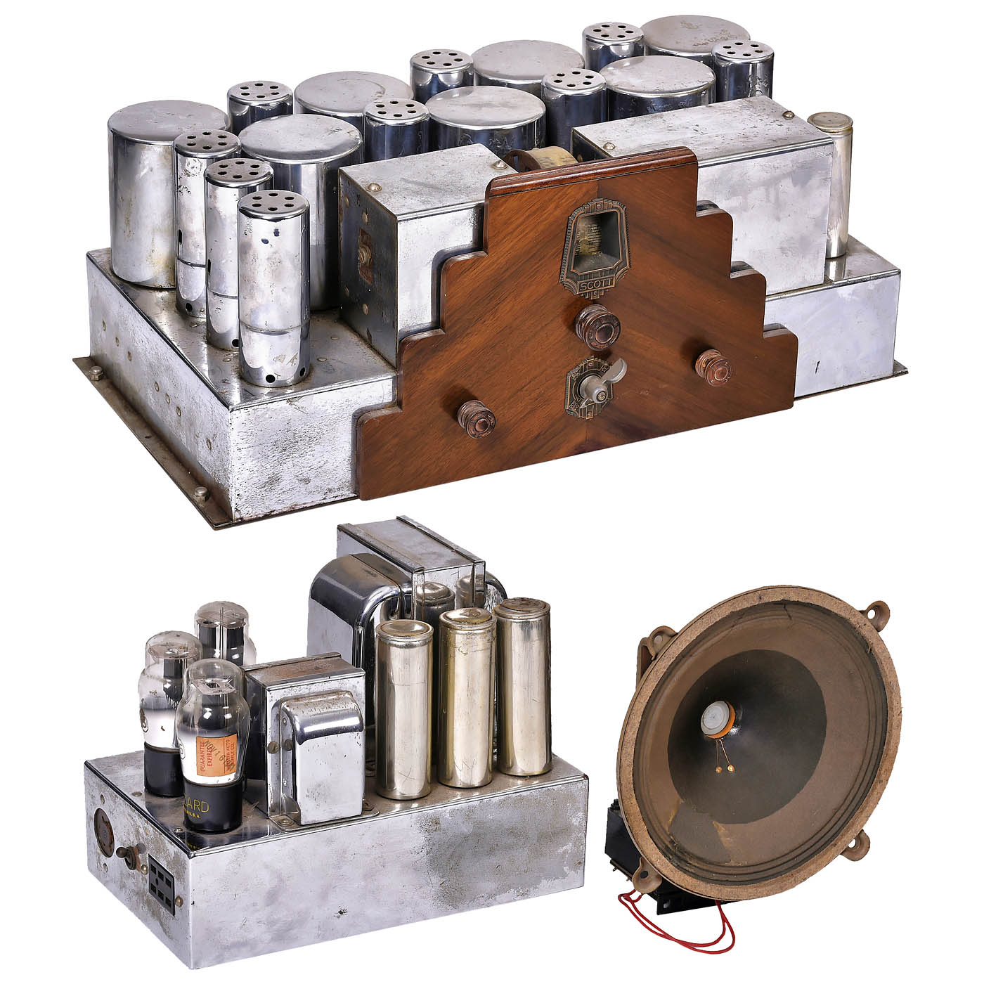 Scott Radio Labs., Chicago. No. F-184, American radio receiver, built-in unit, 12 tubes including one Wunderlich tube, short wave and medium wave, 110-120 volts AC, chrome chassis, wood front, with matching power supply (also chrome) and speaker.