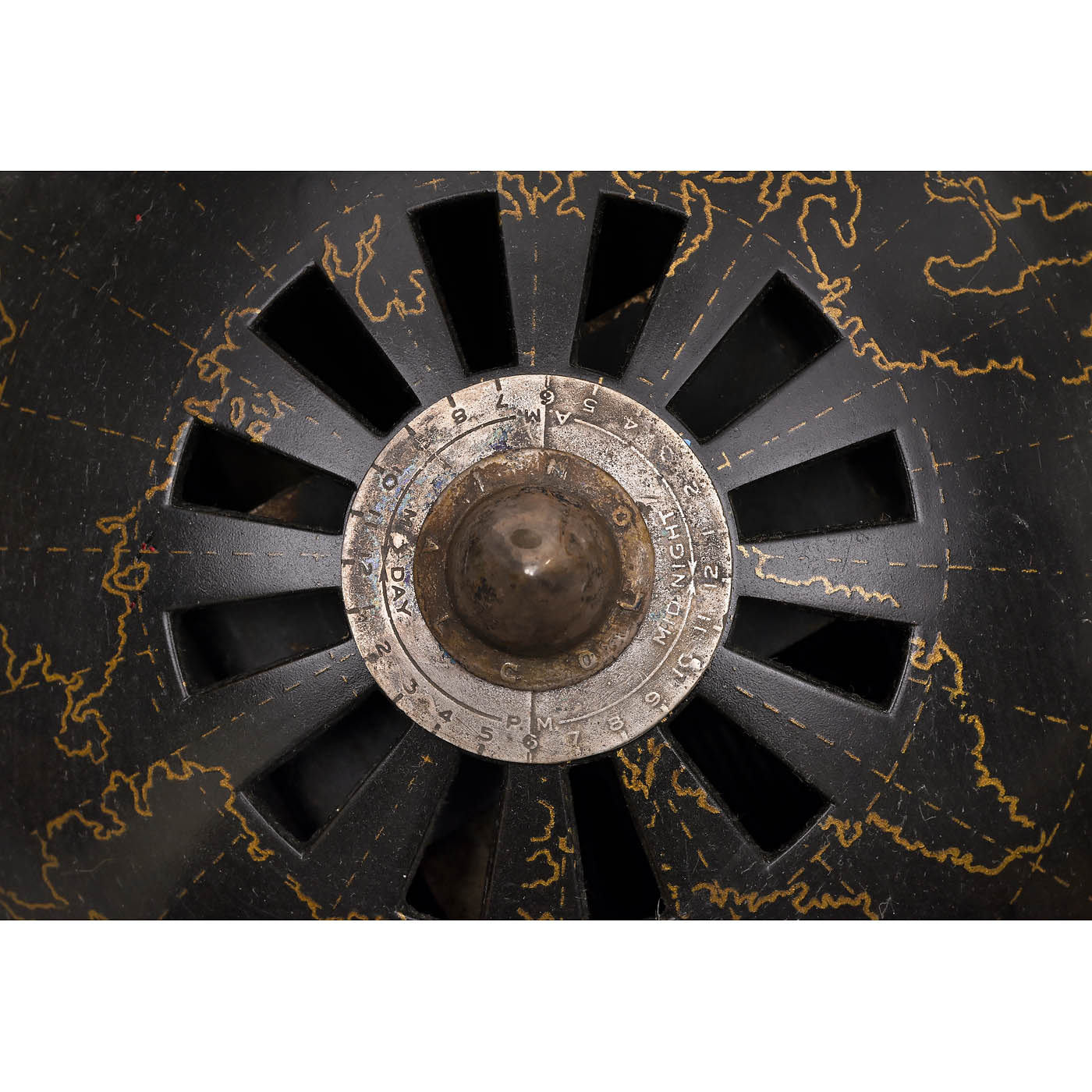 Colonial Radio Corporation, Buffalo, N.Y. Design patent no. 90586, designed Raymond Loewy, black bakelite base and globe, gold-painted continents, chrome-plated metal equator ring, illuminated dial, 5-tube AM receiver in globe and chassis, height 15 ¾ in., untested, good condition.
