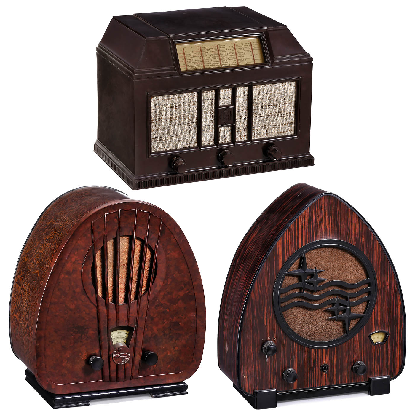 1) Telefunken Admiral 346 WL, c. 1933, Telefunken Germany (TFK), five tubes, long wave and medium wave, 110-240 volts AC, built-in dynamic loudspeaker, bakelite case in very good condition, complete with tubes and rear panel. - 2) Philips 930A, 1931, 4 tubes, MW + LW, integrated loudspeaker, mains-powered, also known as the 'Ham', Arbolite case, complete with tubes and rear panel. - And: 3) Philips 834AS, c. 1933, France, 5 tubes, long wave and medium wave, mains-powered, integrated speaker, Philite case, complete with tubes and rear panel.