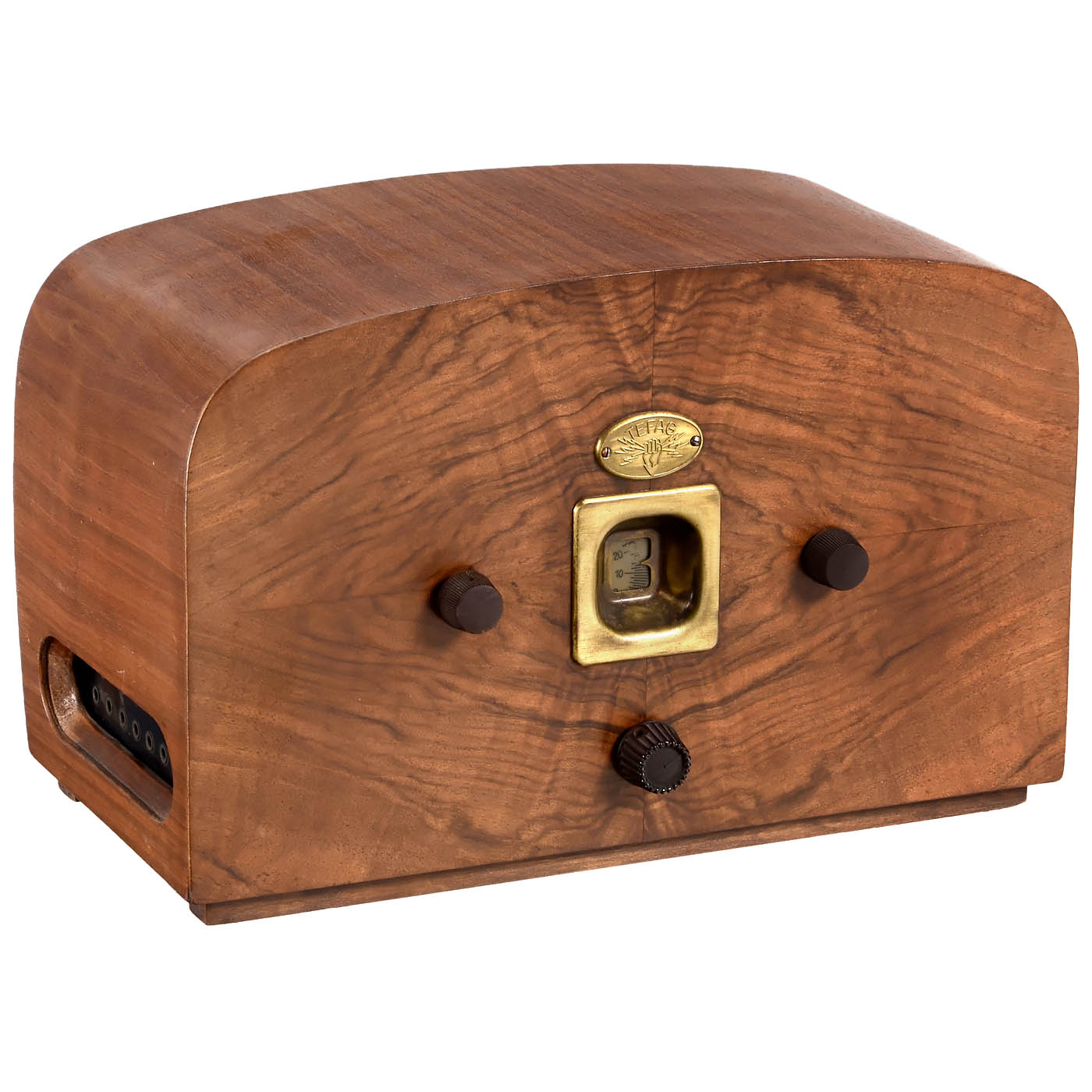 Except for DKE 38 B, all for mains-operation. 1) Super SH467W, c. 1948, Siemens & Halske. - 2) Sagitta 363 BD363A, c. 1956, Philips Radios, Germany. - 3) 2K47-U71, c. 1948, Schaub-Lorenz. - 4) Heinzelmann W, c. 1947, Grundig Radio-Vertrieb. - 5) 300W, c. 1932, Tefag, Telephon Aktiengesellschaft vorm. J. Berliner. - 6) Philetta 203U, c. 1941, Philips, Eindhoven. - 7) 31aW, c. 1930, Siemens & Halske. - And: 8) Deutscher Kleinempfänger DKE 38 B, c. 1938, Minerva-Radio (Radiola-Radioapparate und Bestandteile W. Wohleber & Co), Vienna. - All units complete with tubes and rear panels.
