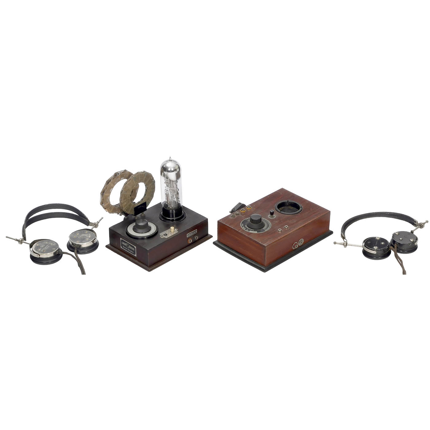 No. 5287, Berlin Steglitz, wood case, 3NF tube (filament intact), with plug-in coils and cords, good condition, with earphones by Neufeldt & Kuhnke, 2000 ohms. - In addition: Old bench-built OE333, without tubes and coils, with Saba earphones.