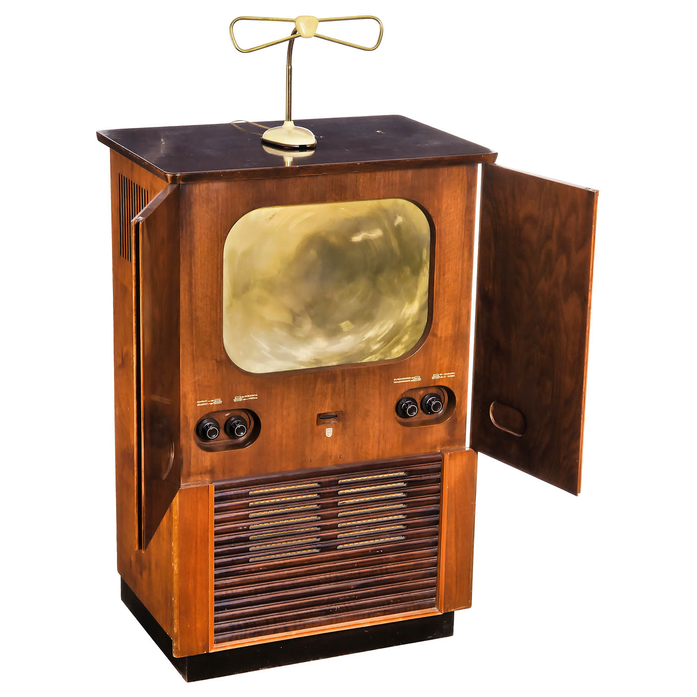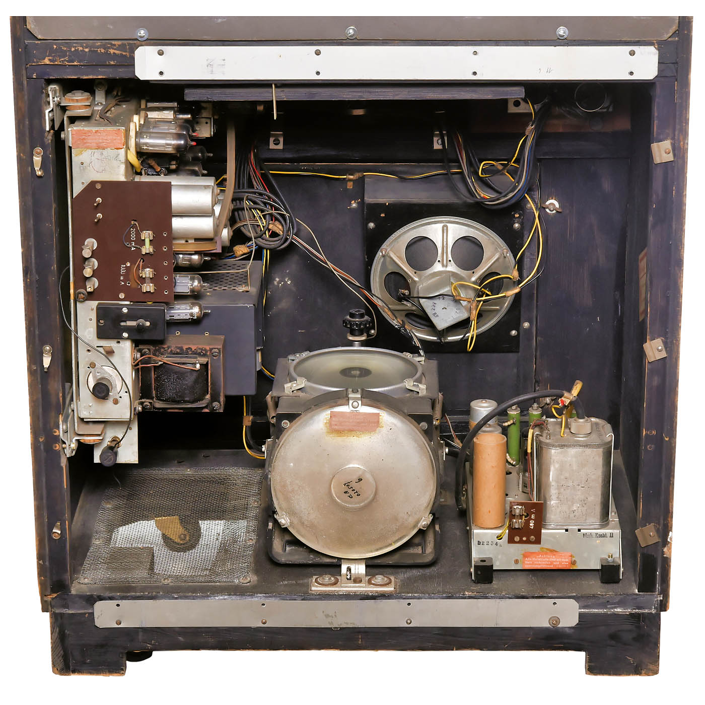 Deutsche Philips-Gesellschaft. Television receiver with projection via Schmidt optics and plastic Fresnel lens, picture size 17 ¾ x 13 1/3 in., 32 tubes, 10 VHF channels, 220 volts AC, dynamic loudspeaker, floor-standing wood case, 29 x 44 x 19 in., complete with tubes, rear panel and indoor antenna.