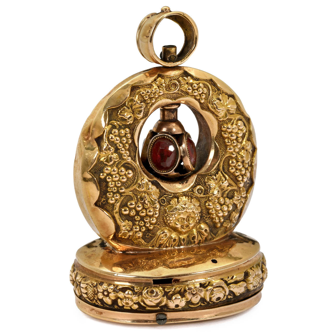 With single-air barillet musical movement, pinned spring-barrel wound clockwise through suspension loop, with stone-set stem, case decorated with repoussé flowers and grapes, ht. 1 ¾ in. x wd. of base 1 3/16 in. (4,5 x 3 cm), good playing condition. A fine early piece of musical jewellery.