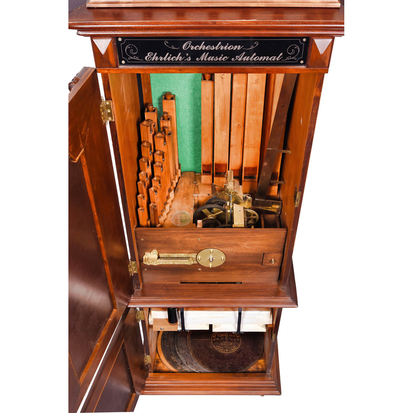 Paul Ehrlich Leipzig. "Orchestrion Ehrlich's Musik Automat", coin-activated automatic flute movement for 11 ¾ in. Ariston discs, 26 wood pipes, coin-slot on the side, walnut case, front with 2 replacement painted metal panels (originals included), height 75 in., pediment replaced, excellent playing condition, with 30 discs, 17 of metal. - The only example of this instrument that we know of.