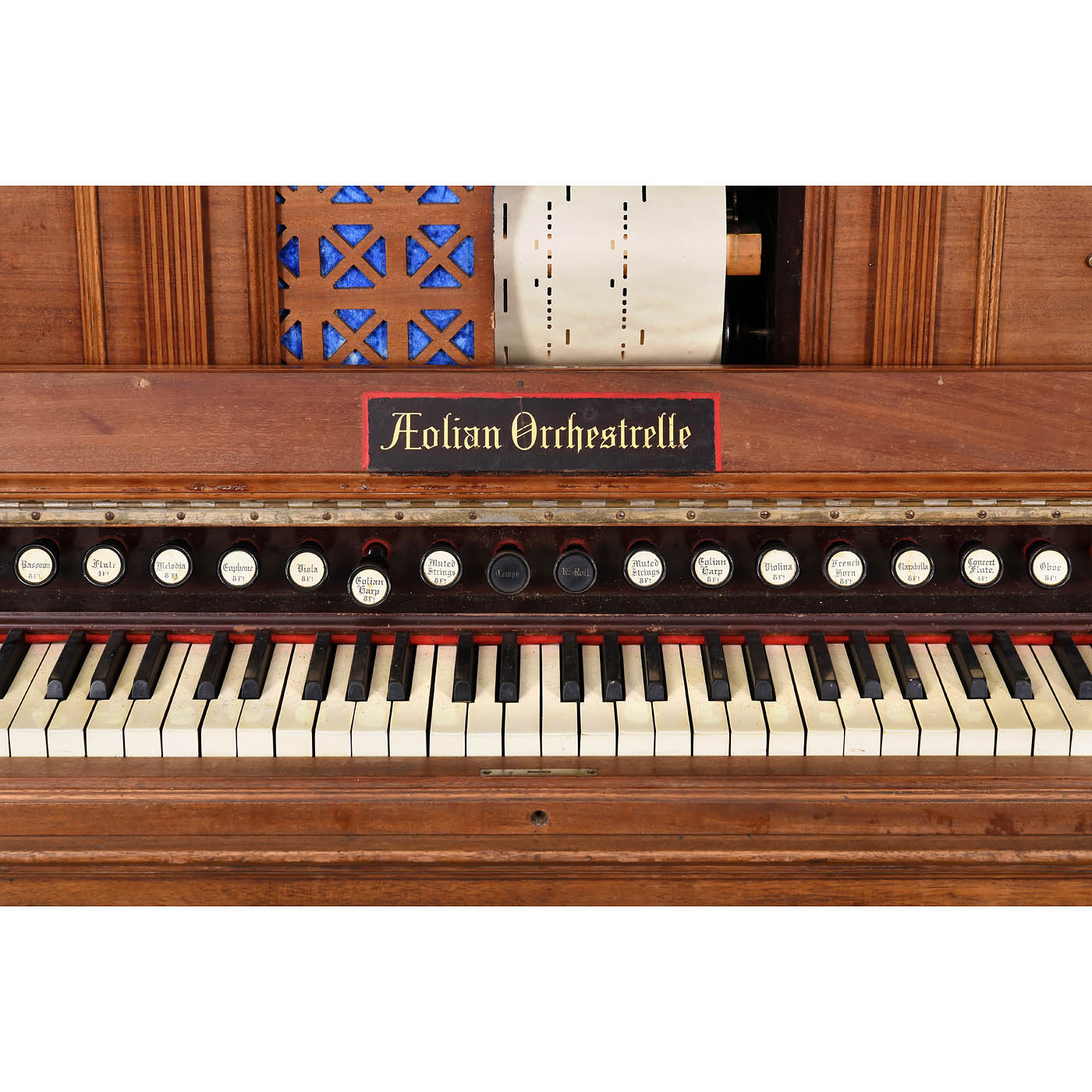 The Aeolian Company, USA. No. 2391, 58 notes, 20 stops, carved mahogany case, 80 x 29 ½ x 71 in., unrestored condition, with 50 music rolls in cabinet. Due to the size and weight transport with a piano shipping company only!