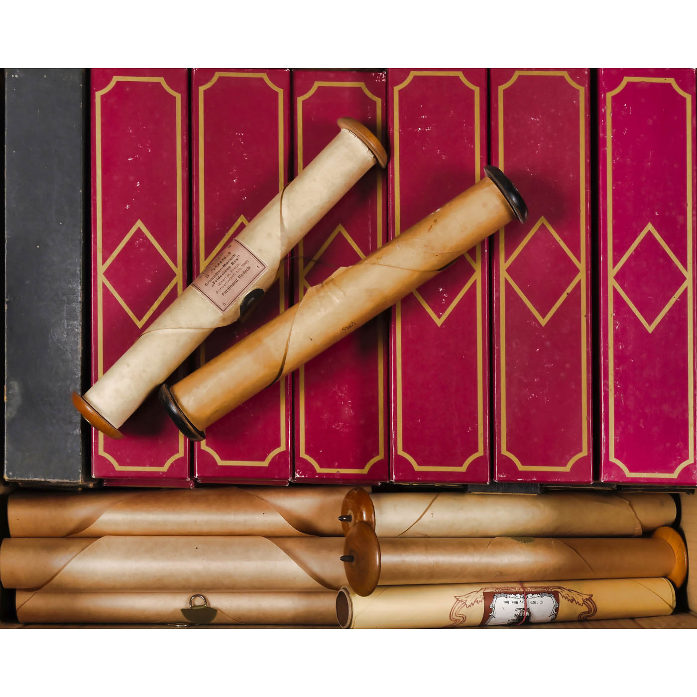 1) Symphonie Jazz, 54 new rolls in boxes. - 2) Symphonie Jazz, 15 old rolls in new boxes. - 3) Phonoliszt Violina, 9 new scale rolls and 3 music rolls, without reels. - 4) Animatic S, 3 old rolls in boxes. - And: 5) Helios, 9 old rolls, partially damaged, without boxes.