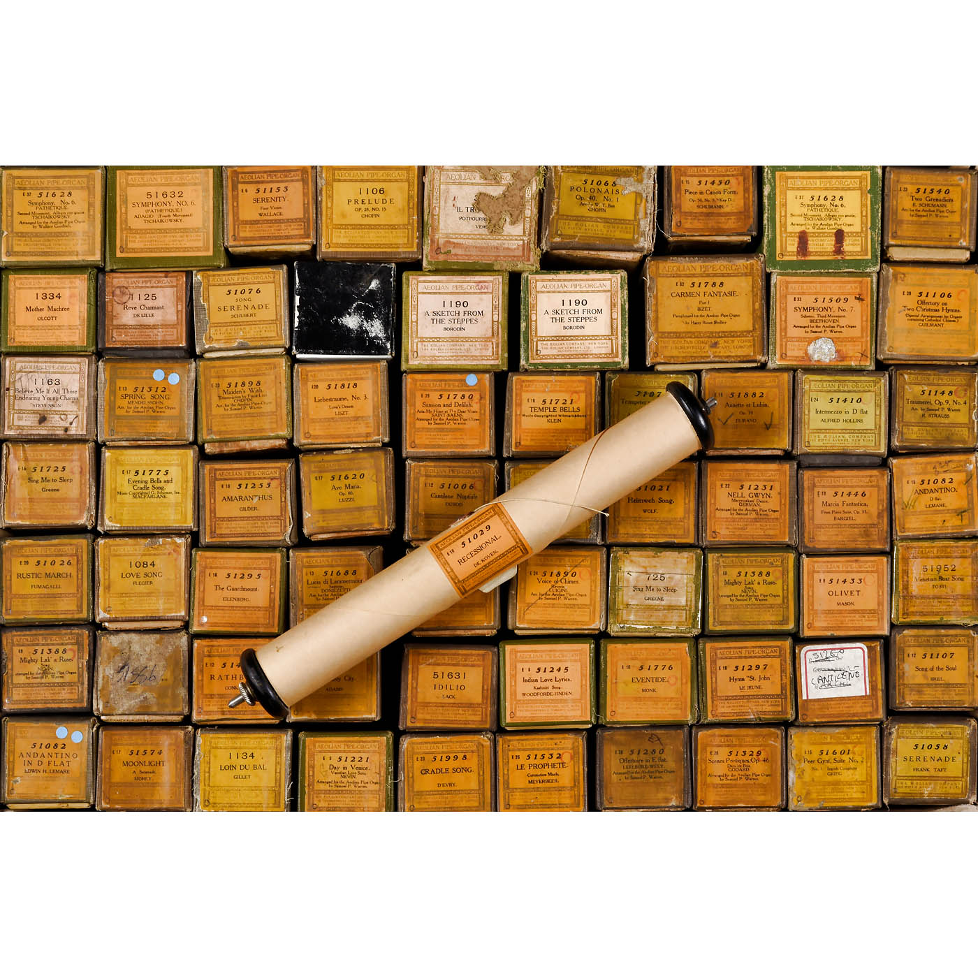 Original rolls by Aeolian Company New York, 116-note rolls, 10 1/8 in. wide, various genres but predominantly classical, mostly in original boxes. Condition: signs of wear to boxes, rolls not tested.