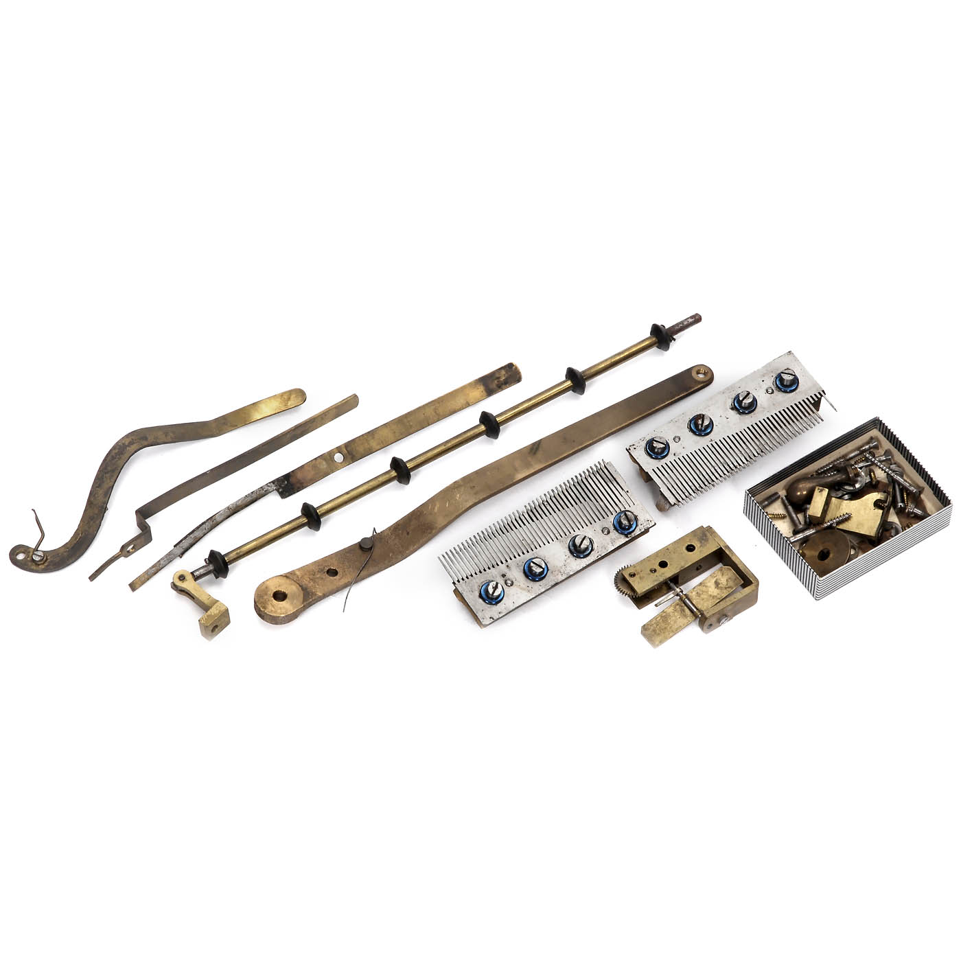 Symphonion Musikwerke, Leipzig. 1) Steel comb with motor, for 11 ¾ in. discs, 84 teeth in duplex comb (5 broken). - 2) Symphonion No. 25, for 11 ¾ in. discs, walnut case in very good condition, two brass handles, original lithograph in lid, mechanism dismantled, probably not complete. - 3) 2 steel combs with bedplates and motors, for 13 ¼ in. discs, 120 teeth in duplex comb each (one complete but rusty, one missing several teeth). - 4) Motor with bedplate. - 5) Symphonion No. 48, for 10 in. discs, 48 teeth in steel comb (1 broken), motor defective, walnut case, with crank and 5 discs. - And: 6) 2 empty cases, one with brass handles, both with original lithograph in lid.