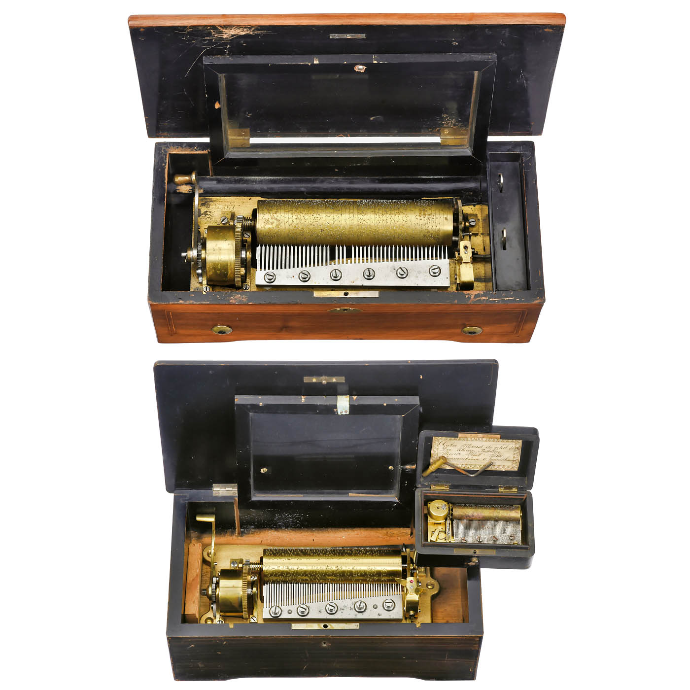 1) Six-air movement, no. 2311, with 57 teeth in comb (complete, one tip repaired), in associated grained case with transfer of a cavalier on the lid, wd. 14 in. (35 cm), cylinder 6 in. (15 cm), overall good restored playing condition but stop / start and change / repeat sticking, missing case controls and dividers. - 2) Ten-air movement, no. 2224, with 47 teeth in comb (missing two), in walnut case, wd. 17 in. (43 cm), cylinder 8 ¼ in. (21 cm), poor condition. - And: 3) Four-air tabatière movement, with tune-sheet and ebonized case, wd. 5 in. (12.5 cm), missing case controls.