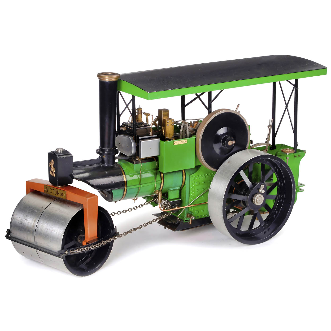 Model of the 8-ton 'C' class roller built by Aveling & Porter Ltd of Rochester, Kent, coal-fired, with reversible two-gear transmission, steerable front axle with chains, parking brake, manometer, water gauge level, mechanical lubricator, feed pump, driver's stand with canopy, fixed cylinder Ø 1 1/4 in., crankshaft with counterweights, boiler Ø 4 in., flywheel Ø 6 4/5 in., overall size: 36 x 12 ¾ x 21 2/3 in., complete with all fittings, good condition, untested. - A fascinating model of first-class engineering quality.