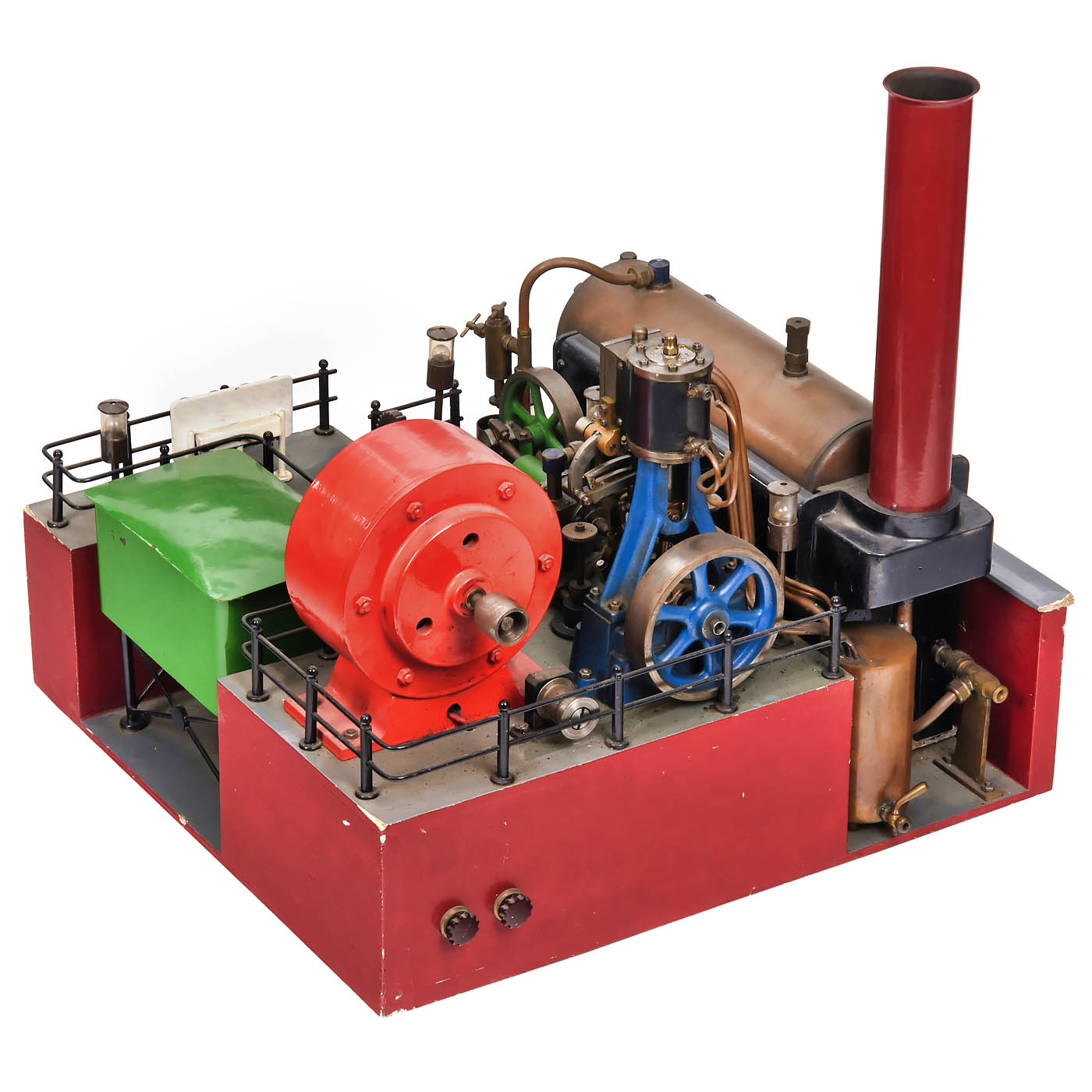 Stuart Turner, England. Comprising boiler No. 504 with ceramic gas burner, length 13 ¾ in.; No. 7a vertical stationary steam engine, height 7 ½ in., and No. 10H horizontal stationary steam engine, length 6 in.; feed pump, dynamo, lamps and water tank by other makers on wood base, overall size 17 x 16 ½ x 17 in., untested.