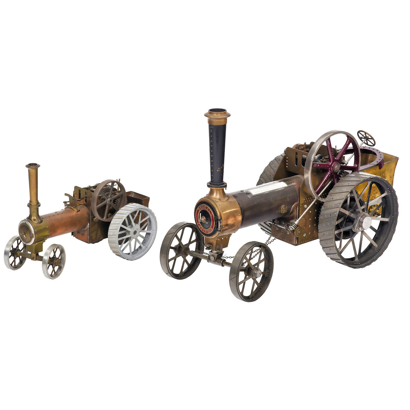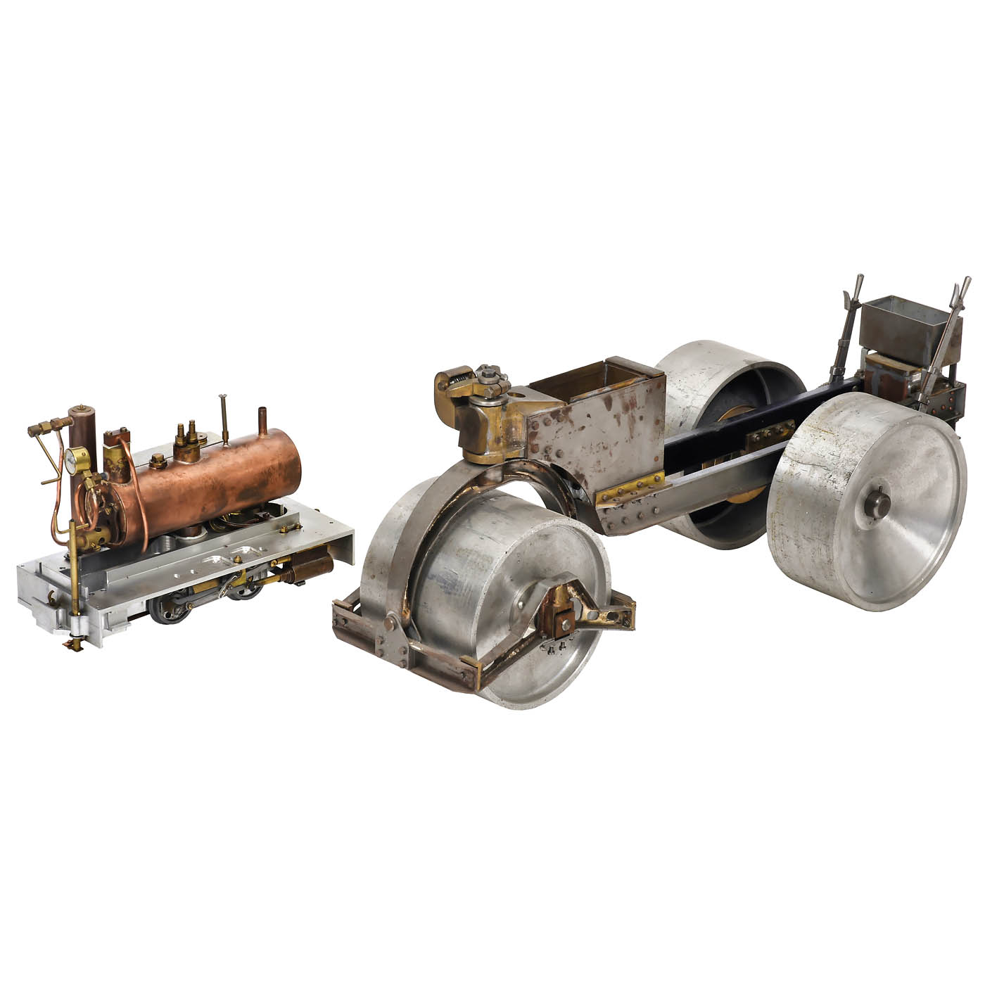 1) 1 1/2-inch scale Burrell model traction engine (under construction), length 22 in. - 2) 1 ½-inch scale model road roller, consisting of frame, wheels and brake, length 22 in. - 3) Model of a tram, spirit-fired copper boiler, 2 cylinders, without coachwork. - 4) Model traction engine, unfinished, length 13 in. - 5) Side trailer, wood body, spoked iron wheels, length 12 in. - And: 6) Cox Command Jeep, with Webra 3,5 cm³ combustion engine, length 19 in.