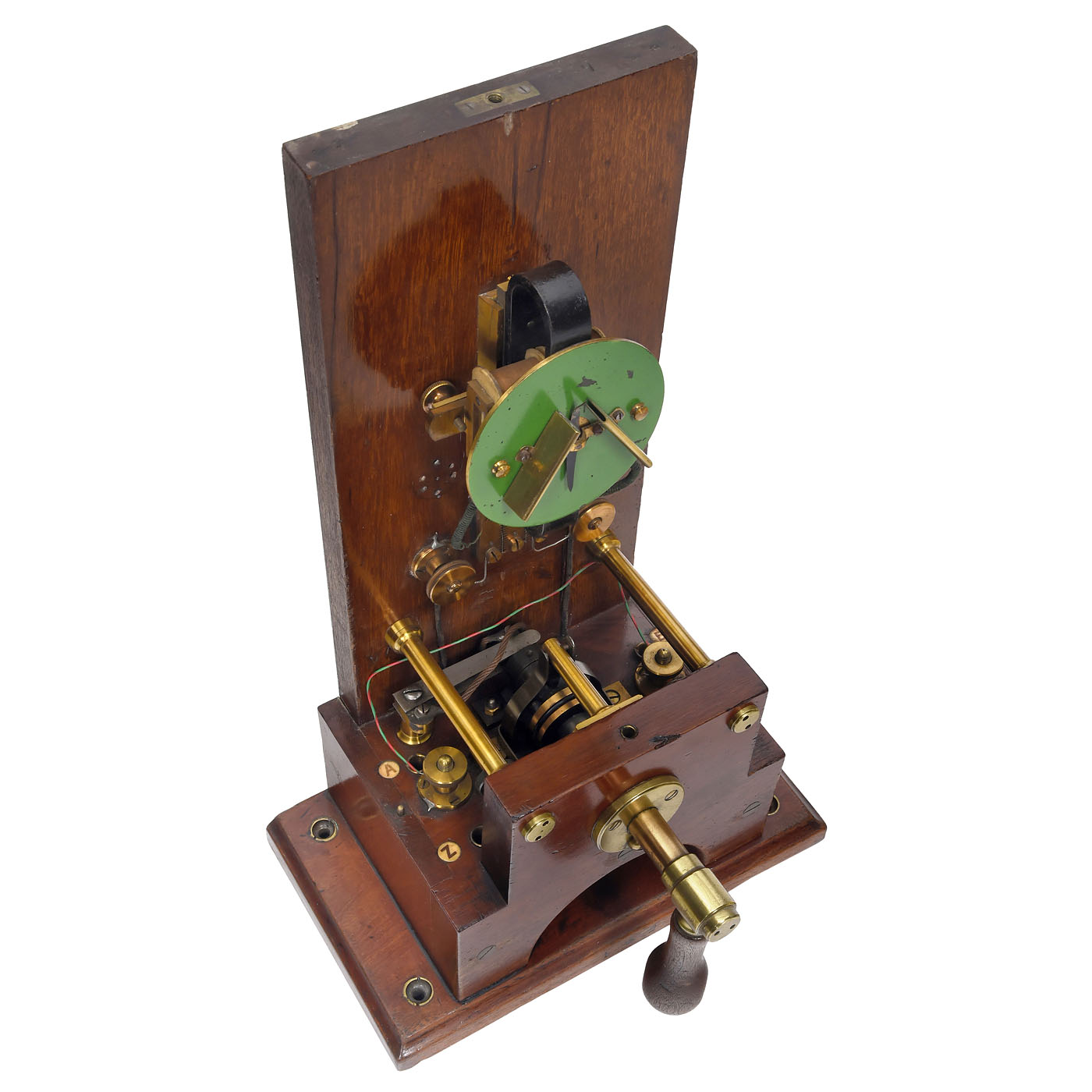 Patented by Cooke & Wheatstone in 1845, solid mahogany case, stamped "1029", with large pump handle to control the needle deflection to the right or left, brass and steel internal mechanism, height 19 in. - Note: The needle telegraph was used by the British railways to transmit messages between stations along the train route. Single-needle telegraphs were used by the railway administration from the middle of the 19th century until the 1930s.