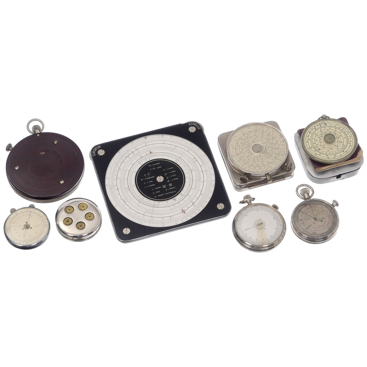 1) Fowlers's Textile Calculator, type B, 1927 onwards, Fowler & Co., Manchester, Ø 3 2/5 in., in leather case. - 2) Halden Calculex, 1908 onwards, Joseph Halden, Manchester, Ø 2 1/3 in., in aluminum box with 95-page miniature instructions. - 3) Fowlers's Long Scale Calculator, c. 1935, Fowler & Co., Manchester, Ø 2 3/5 in., in nickel-plated hinged box. - 4) American Cash Register Company, for cents and dollars, Ø 1 7/8 in., in wood box. - 5) Cerle à Calcul, c. 1900, A. Boucher, Havre, Ø 2 in. - 6) Calculateur Roplex, c. 1960, Raphoplex, France, 5 x 5 in., with instructions in leather case. - And: 7) 2 further Boucher-style calculating clocks, unmarked.