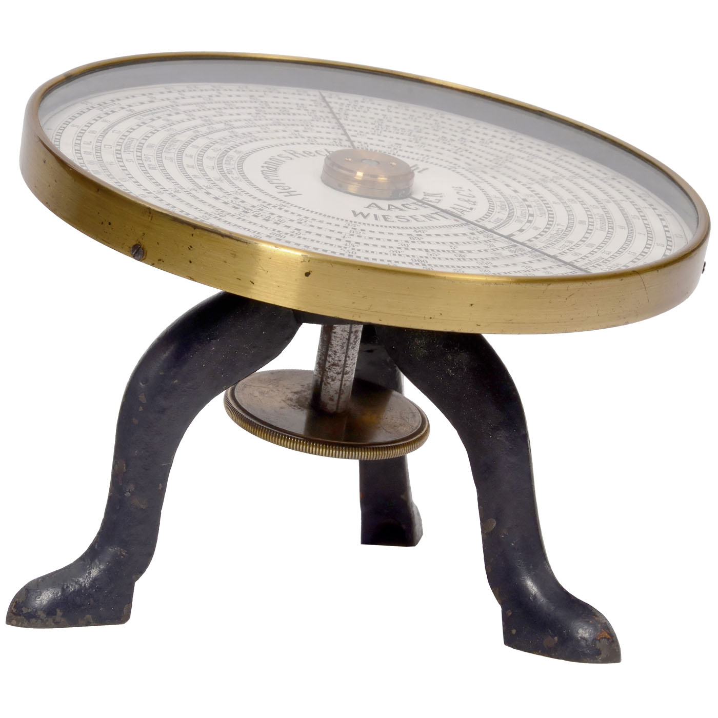 Logarithmic circular slide rule by Wiesenthal & Cie., Aachen, Germany. Brass-mounted scale, 6 ¼ in., on cast-iron tripod. Very rare!