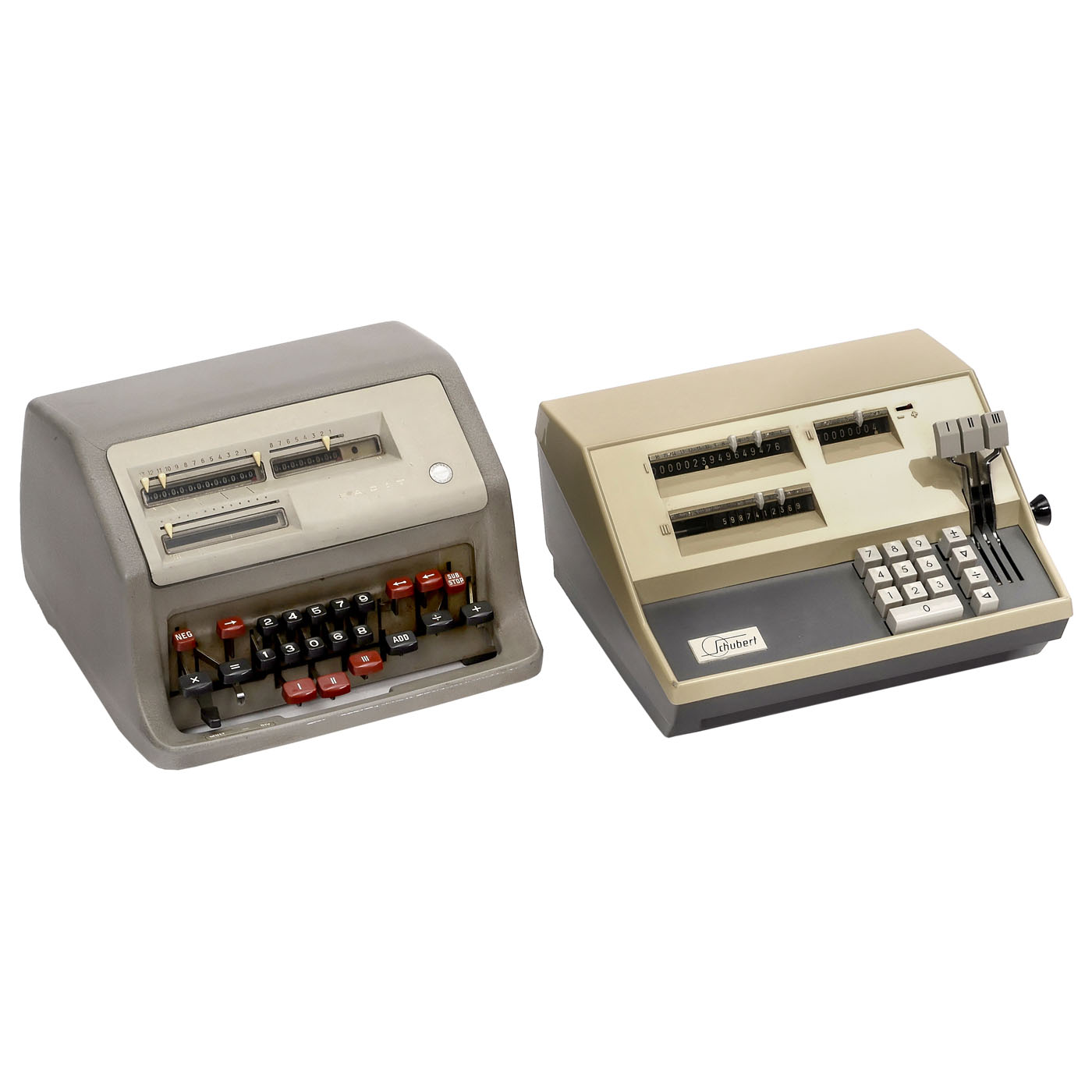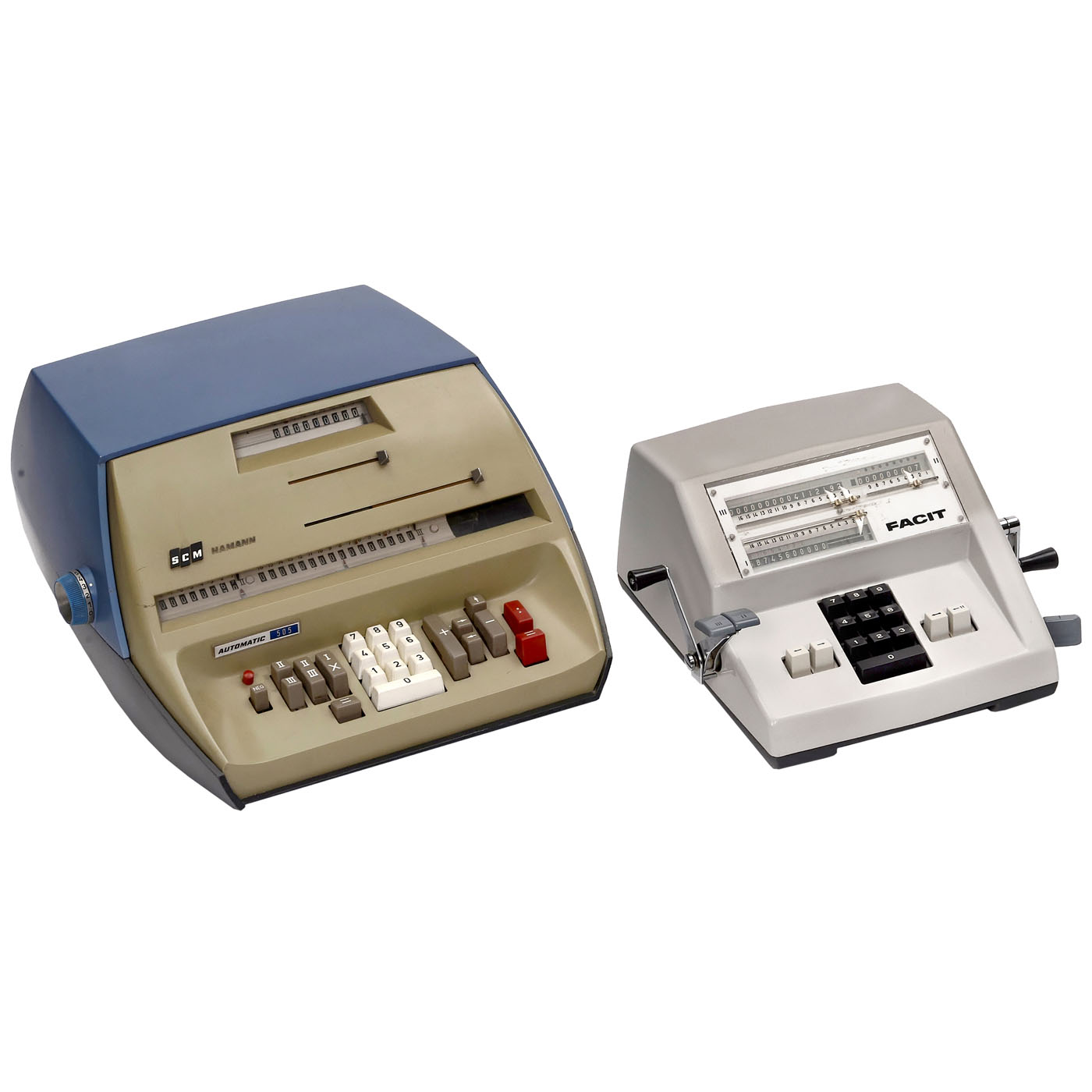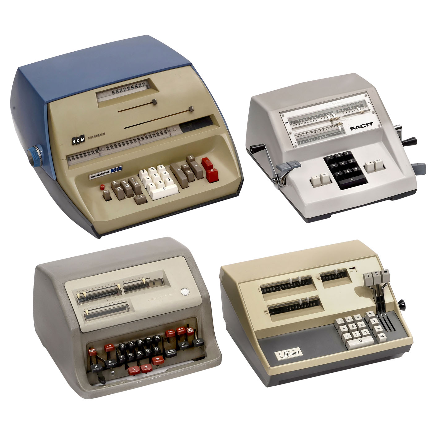 1) Schubert E, no. 1218, c. 1965, pin-wheel machine with keyboard input, sticking. - 2) Facit CA 1-13, 1964 onwards, Sweden, electric pin-wheel machine, untested, with advertising record. - 3) SCM Hamann Automatic 505, 1962 onwards, Berlin, pawl system, electric drive, untested. - And: 4) Facit 1004, c. 1970, Germany, pin-wheel machine with keyboard input, works.