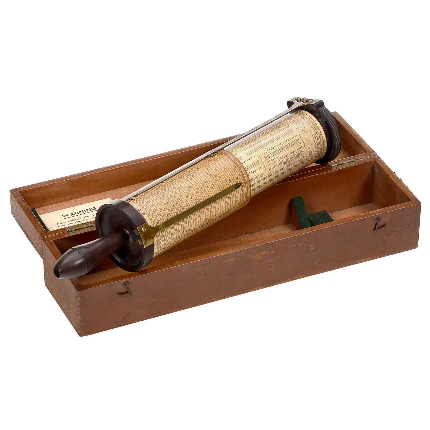 1) Albert Nestler's logarithm calculating drum, c. 1935, 14 4/5 in. scale, 24 ½ in. wide, paper worn, minor damage. - 2) Albert Nestler's logarithm calculating drum, c. 1935, small version, 10 in. wide, paper worn, minor damage. And: 3) Professor Fuller's Slide Rule Calculator Mod. 1, logarithmic calculating drum by George Fuller, made in England by Stanley, bakelite, very good condition, with original wood box.