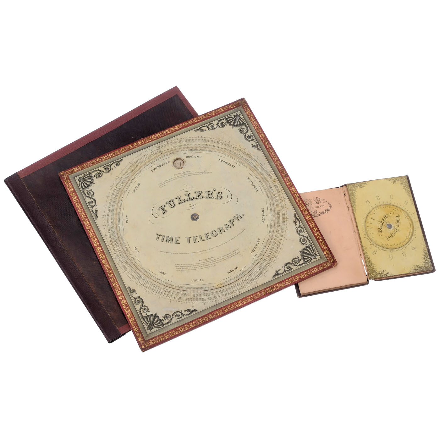 1) Fuller's Time Telegraph and Palmer's Computing Scale, c. 1852, USA, double-sided circular calculator, 11 in. square cardboard, front with Fuller's Time Telegraph which enables the number of days, weeks or months to be determined between two given dates without calculation, reverse with Palmer's Computing Scale, logarithmic scales on two circles to calculate different mathematical problems, loosely inserted in card binding, inside cover with printed instruction manual. - And: 2) Palmer's Pocket Scale, 1845, Aaron Palmer, "Palmer's Pocket Scale, with Rules for Its Use in Solving Arithmetical and Geometrical Problems", Rochester 1845, embossed hardcover, 48 pages with instructions, engraved volvelle on card, mounted on rear inner cover, size 3 ¾ x 6 in., cover with minor damage.