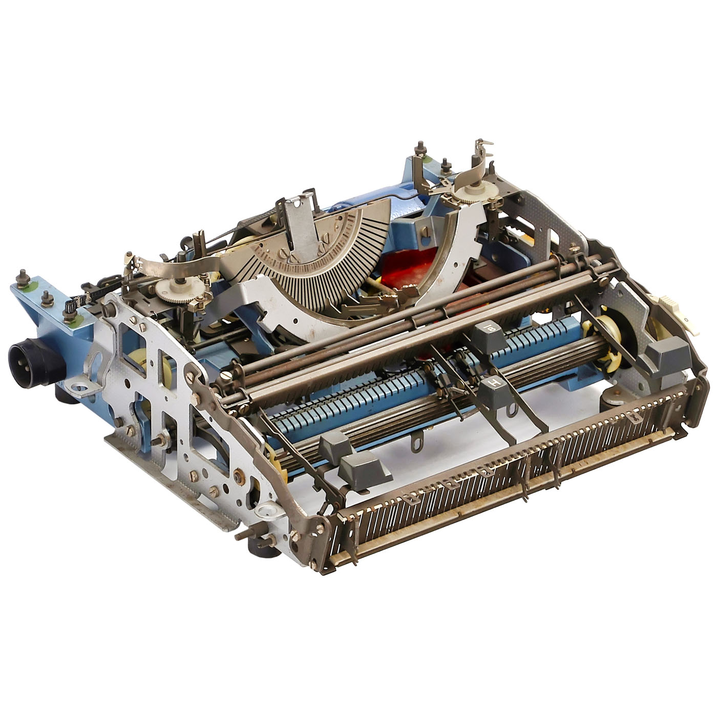 1) Olympia, electric, partial cutaway model, with motor, carriage and parts of the mechanism. - 2) Adler, working model with 5 keys, tabulator and keys for the carriage train, very interesting. - 3) Olympia, electric, traveling typewriter, with half-keyboard and half-set of keys. - 4) Triumph, frame with 3 keys and shift key, without carriage. - And: 5) Olympia SGE35, electric, with 2 keys and motor.