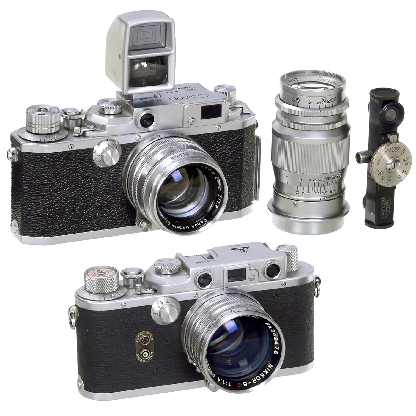 1) Nicca, Japan. "Tower" - Nicca 3S version, no. 52188, long shutter times weak, with Nikkor 1.4/5 cm no. 349476, glass clean under point light. (3/3-) - 2) Canon, Japan. Canon II D1 no. 71757, with Canon Lens 1.8/50 mm no. 129325, front lens with cleaning marks. (3/3) - 3) Zeiss Ikon viewfinder 427, with case. (3/3) - 4) Leitz, Wetzlar. Elmar 4/9 cm no. 675197, with both caps and tube, glass clean under point light. (2-/3+) - And: 5) Leitz rangefinder FOFER, for Nagel. (3/3-)