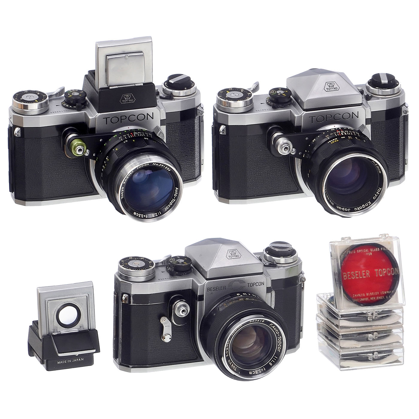 Tokyo Kogaku, Japan, 24 x 36 mm SLR for Exakta bayonet. 1) Topcon R no. 154192, with prism viewfinder, Auto-Topcor 1.8/5.8 cm, glass clean under spotlight, aperture closing somewhat slowly, in near-mint condition, with instructions. (2/3) - 2) Topcon R no. 159563, with waist-level viewfinder, Auto-Topcor 2.8/3.5 cm, glass under spotlight clean, in near-mint condition. - In addition: waist-level finder hood, a different model, with case and box. (2/2). - And: 3) Topcon RII as Beseler C Topcon, no. 302352, diaphragm control changed from external arm to internal type, with F.Auto-Topcor 1.8/5.8 cm, front element with cleaning marks under spotlight, camera with heavier traces of use, with 4 Beseler Topcon filters: yellow, orange, green and red. (3-/3)