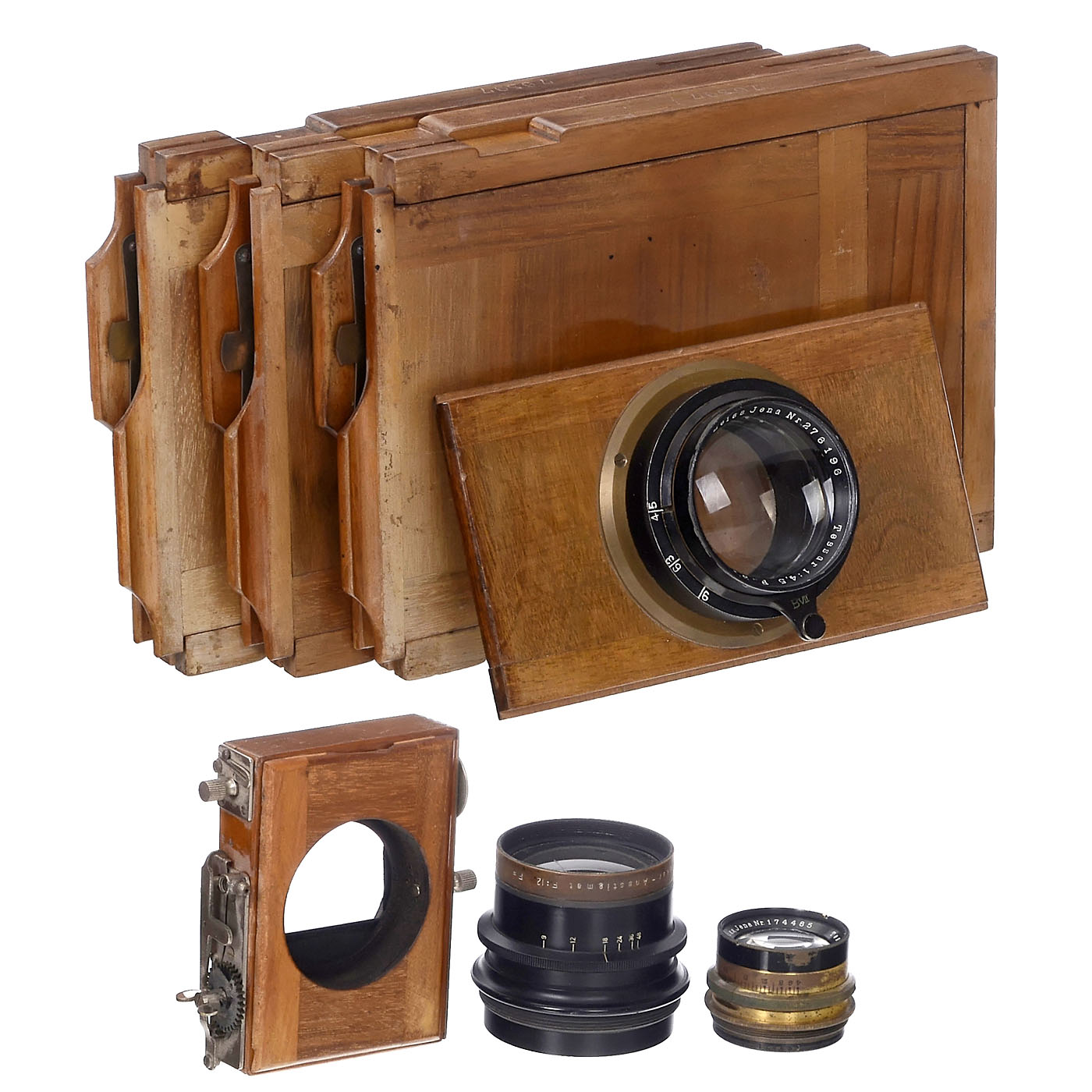 Loeber, Dresden. Comprising two almost identical view cameras by the same manufacturer, 13 x 18 cm, with slot-in frame, green bellows with red corners, stable construction. 1) Camera with Loeber label, Loeber Universal Aplanat Extra Rapid Series A lens no. 19043, with attachable Thornton-Pickard shutter (working) and Zeiss Jena Tessar 4.5/13.5 cm lens no. 174485 in a brass mount that fits the thread. - 2) Camera without Loeber label, rare version with front standard that can be swiveled back and forth, without handle, with Zeiss Tessar 4.5/15 cm lens. - 3) Original additional plate board for two lenses: Zeiss Tessar 4.5/21 cm no. 276196, in a mount similar to that for aerial cameras, lens can be stopped down to aperture 9, and a Busch Leukar Anastigmat 30 cm no. 437509 (Dagor type), the front element engraved as a set lens 1:12 without focal length (approx. 62 cm). - And: 4) 3 matching double cassettes, some with sheet film inserts. - Note: The outfit of a part-time photographer who remained true to his first camera but extended his repertoire with the acquisition of an adjustable camera of the same type, perhaps to capture carnival events (an underexposed 13 x 18 cm negative served as a sheet film holder), hence the bright 21 cm Tessar.