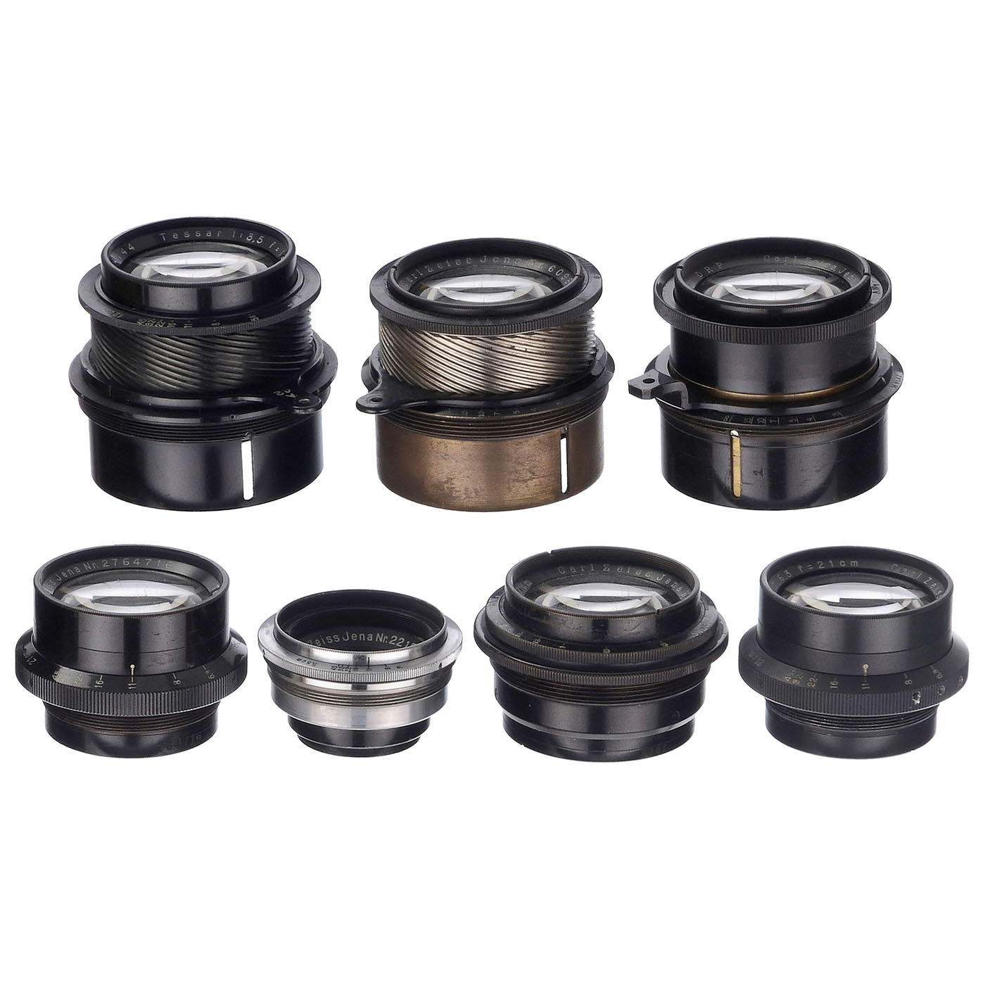Carl Zeiss, Jena. 1) Tessar 8/5.5 cm, for Exakta 4 x 6.5. (3/3) - 2-3) Tessar 4.5/15 cm and Tele-Tessar 6.3/25 cm, both with helical mounts for the same screw ring. (3/3) - 4) Tessar 6.3/15 cm in recessed helical mount, rare type no. 2561074 from 1939, for a 9 x 12 cm reflex. (3/3) - 5) Tessar 4.5/15 cm no. 562685, with original shortened rim leaving curved front lens unprotected, previously undocumented, in Compur, probably for an Orion Tropen 9 x 12. (3-/3) - 6) Tessar 3.5/12 cm, helical mount. (3/3) - 7) Tessar 4.5/15 cm, recessed mount. (3/3) - 8) Tessar 4.5/15 cm, helical mount. (3/3) - 9) Apo-Tessar 9/24 cm. (3/3-) - 10-11) Tessar 6.3/21 cm, in gray (military) and black N42 mount. (3/3) - 12) Tessar 3.5/25 cm, front lens with cleaning marks, mount incomplete. (4/4) - And: 13) Tessar 4.5/30 cm, in N88 mount. (3-/3-)