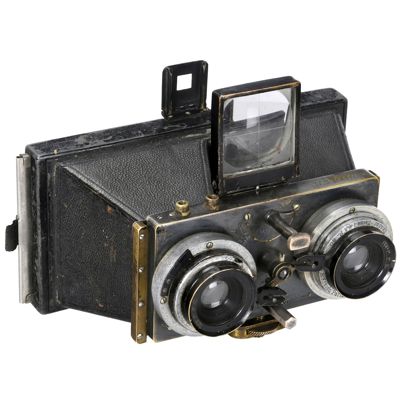 Bazin et L. Leroy, Paris. No. 8118, for 6 x 13 cm stereo plates, rare and early aesthetic camera with leather-covered double-conical metal housing, front of blued sheet metal and brass fittings, Krauss Paris Tessar-Zeiss 6.3/80 mm lens, iris diaphragms 6.3 to 32, unusual focusing up to 2 meters, screw for vertical adjustment, large Newton viewfinder and inserted cassette, rotating sector shutter working, iris adjustment stiff, chipped on the back of the slot.