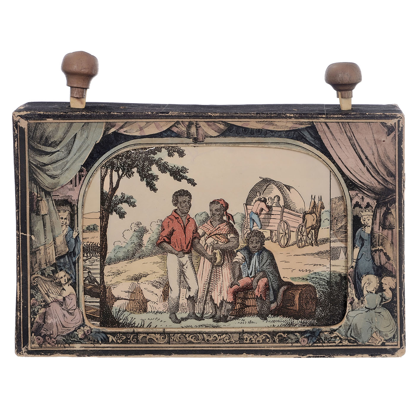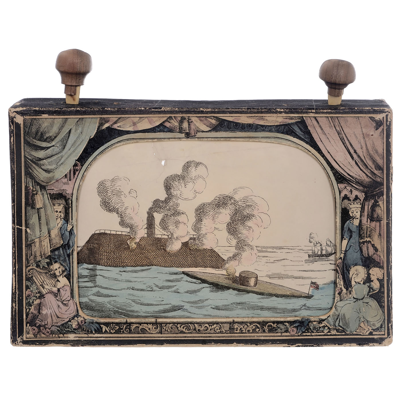 Milton Bradley & Co, Springfield. Roll panorama depicting the American Civil War in 22 hand-colored images, in box with original lower lid, upper lid with carefully replaced title, a few images with repaired tears, easy to rotate, cranks replaced. An historical American document.
