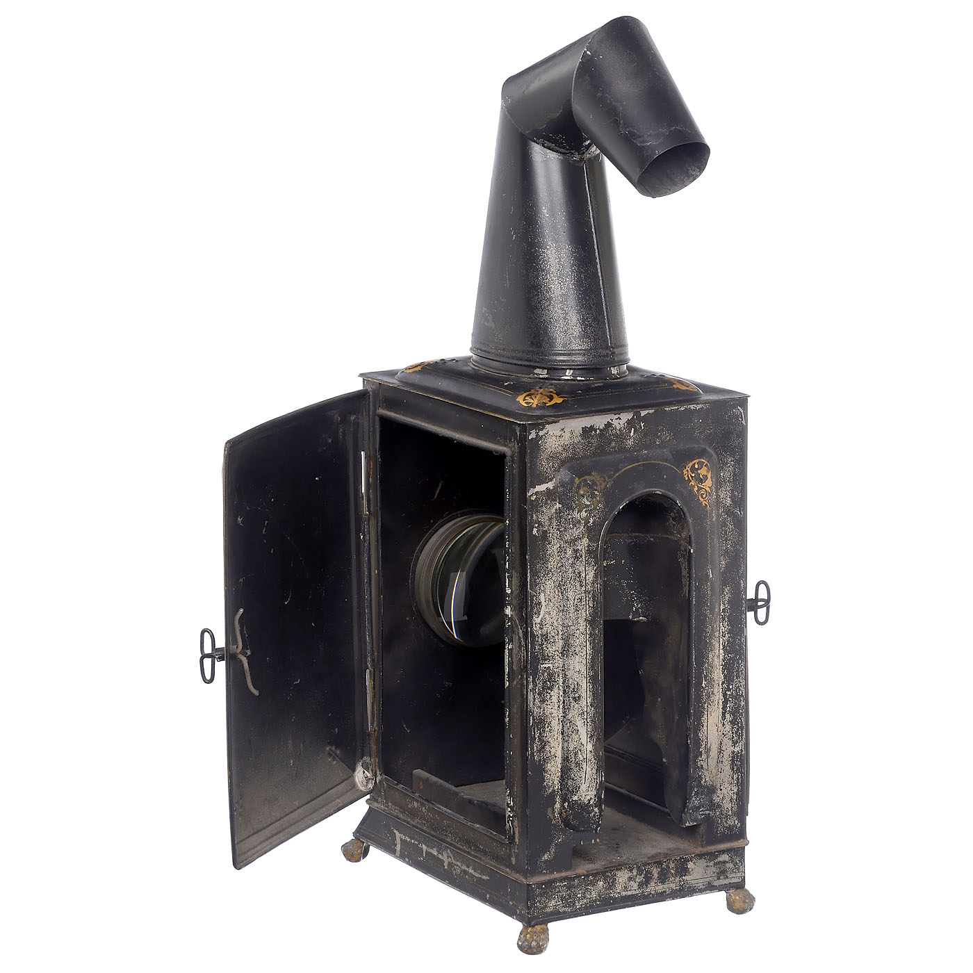 Benjamin Pike & Sons, 518 Broadway, N.Y. For 5 ¼ in. wide slides, tin case with gilt pinstriping and feet, large arched doors on both sides, company inscription on the front and sides, back with arched opening of 11 x 2 ¾ in. for inserting a period portable lantern (a portable bull’s-eye lantern also known as a police lantern or a dark lantern) for illumination, complete 2-element brass lens with rotating brass lid, double condenser of 104 mm Ø, height with chimney 27 in. - An early and imposing American magic lantern.