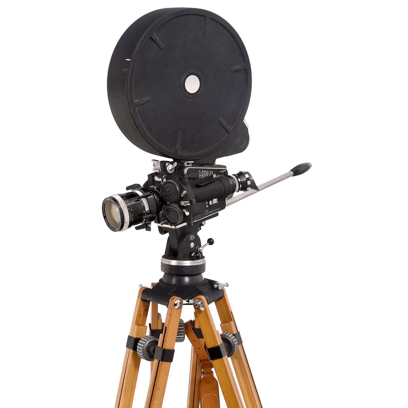 Arnold & Richter, Munich. SLR camera for 16mm film material in 120-meter cassette or for 300-meter reels in the large attachable coaxial cassette, with manual drive motor, Carl Zeiss Vario Sonnar 1:2.8/10-100 mm lens and original Arriflex wood tripod, electrical functions untested. - Note: This camera was produced in parallel with the Arriflex 16 St to meet broadcasters' need for a longer than 10-minute running time for the 120-meter cassette. The running time for the 300m cassette is 25 minutes.