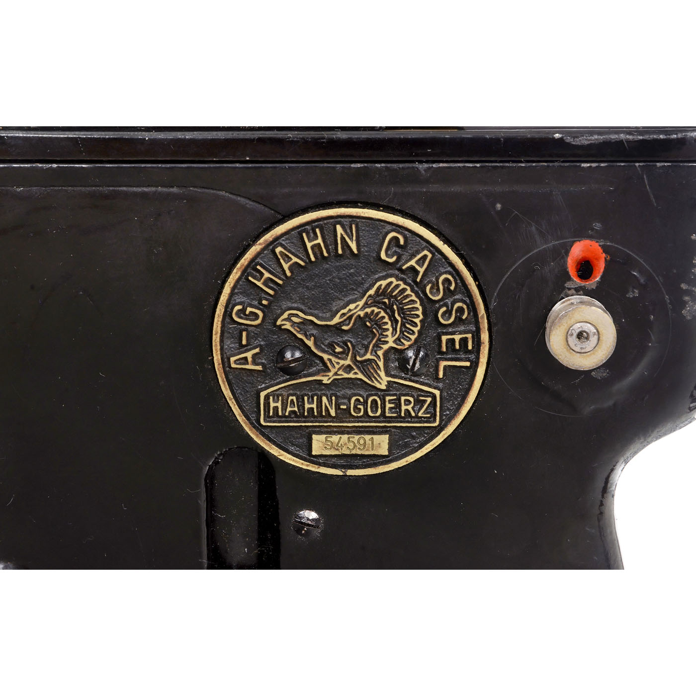 Hahn-Goerz, Kassel, Germany. Tabletop cinematograph for 35mm film on 250-meter spools (film fragments on one spool), hand-turned Maltese cross mechanism and low-voltage lamp in the gearbox housing, electrical functions unchecked. - Note: In standard projectors of the period, the film strip runs vertically in front of the lamp, behind the image window and optics. Numerous deflection and toothed rollers are necessary for this and their operation places high demands on the projector. The Hahn-Goerz home cinema's horizontal film path allows for easier loading, with the result, however, that the image would be projected onto the ceiling. To avoid this, the designer of this projector placed a reflecting prism between the image window and the lens. Rare projector construction.
