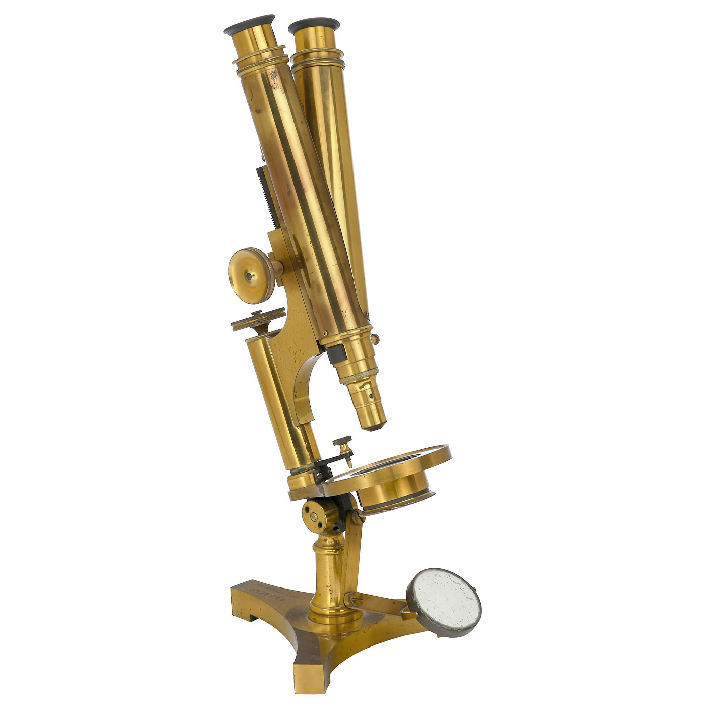 Marked on the base: "R. & J. Beck, London & Philadelphia", no. 11669, original lacquered brass, rack-and-pinion coarse adjustment, micrometer fine adjustment, interocular adjustment, double-mirror, 1 objective lens, 1 pair of ocular lenses, height 13 1/3 in., good condition. - In addition: 29 microscopic preparations in case, several prisms, 2 pairs of ocular lenses, 5 signed brass containers with 3 objectives, and other items.