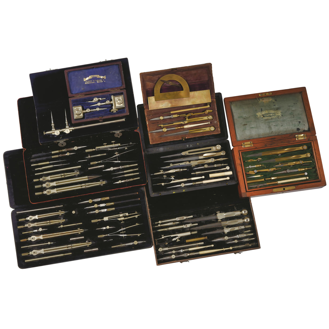 1) "Compass Supérieurs", France, c. 1900, Brevetés S.G.D.G., wood case, lid lined with green silk, a removable tray lined with green velvet, 12 instruments of brass and steel, with 2 compasses, one with replaceable tip for inserting the drawing instruments, case dimensions 18 x 11 cm. - 2) 2 Riefler compasses cases, c. 1920-30, professional models, compartments lined in velvet, both complete. - 3) Beam compass, A. West & Partners, England, c. 1920, in box. - 4) Early compass set, c. 1840, probably England, brass, steel and bone, with proportional ruler. - 5) "Compas Perfectionnes", France, c. 1900, steel and nickel-plated brass, with proportional compass and half-circle protractor. - 6) Dutch compass set, c. 1900, maker not legible, unusual design of the instruments, complete. - And: 7) Beam compasses, unmarked, c. 1900, length 17.5 cm, in case.