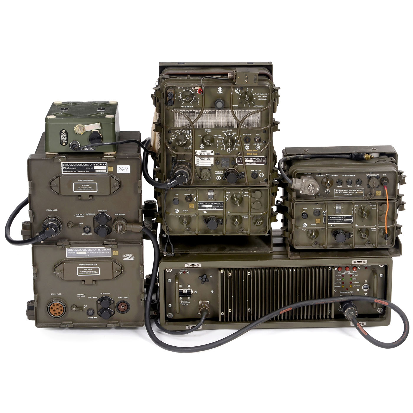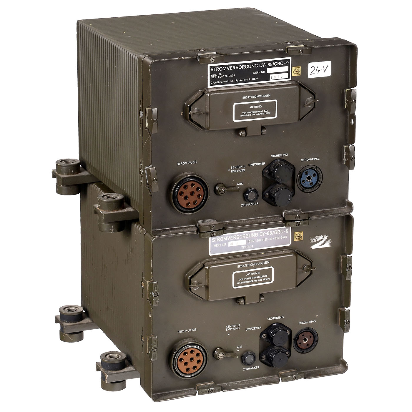 Radio set of the German Federal Armed Forces, consisting of: 1) Transceiver Telefunken RT-77, 11 tubes, 2.0 to 12 MHz in three band ranges, with mounting frame MT-350. - 2) Power supply unit DY-88, for 24-volt input voltage, with voltage converter and chopper two-way rectifier, with a second unit DY-88 as reserve. - 3) Power supply or voltage stabiliser Teure from Benning, 220 volt alternating current supply, output voltage 27.6 volts. - 4) Wheeled case BG-174, with antenna equipment and cables. - 5) Radio receiver Telefunken R-77, with power supply PP-77, 24-volt power supply and loudspeaker LS-7. - And: 6) 2 canvas carrying bags, with extensive accessories including wave meter ME-61, antenna AB-129/SEM35, channel tuner ID-292, Morse key with leg clip J-45, loudspeaker LS-7, 2 Telefunken accessory boxes with tubes and lamps, cables and microphones. - Note: This radio apparatus was part of the original equipment of the Bundeswehr and was used in many NATO countries. The components were developed in America and manufactured under licence by Telefunken and others. - Good condition.