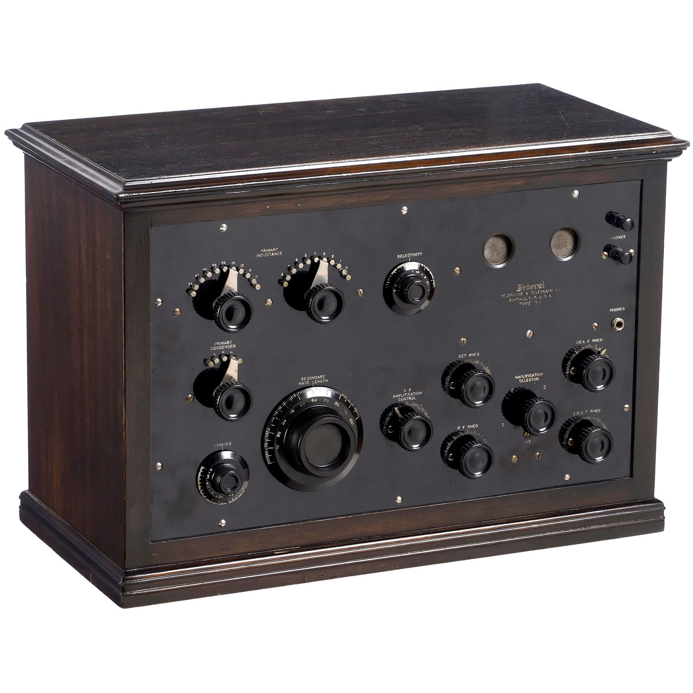 Federal Radio Corp., Buffalo. Very complex 4-tube battery receiver, for external speaker, dark-mahogany case with black bakelite panel, opening lid, width 22 in. Complete with tubes, very good original condition.
