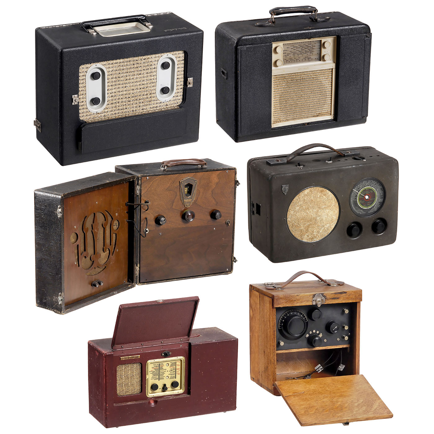 1) Radione R2 (12 V) KW, c. 1942, Radione Radio Nikolaus Eltz, Vienna, 6 tubes, one tube modified, long wave, medium wave and short wave, battery-operation, dynamic loudspeaker, unit for 12V car operation, metal case. - 2) Koffersuper Tourist 38, 1938, Körting-Radio, Leipzig, 6 tubes, long wave and medium wave, dynamic loudspeaker, rear panel with built-in double frame antenna. - 3) Nora Reise-Super K69, 1939, Berlin, 6 tubes, long wave, medium wave and short wave, battery-operation, dynamic loudspeaker, rear panel with built-in frame antenna. - 4) Braun 449D, 1949, Frankfurt, 4 tubes, long wave, medium wave and short wave, battery-operation, dynamic loudspeaker. - 5) Model Tom Thumb, 1929, Automatic Radio Mfg. Co., Boston, model adapted from 4 to 6 tubes, built-in loudspeaker and loop antenna. - And: 6) Crosley 50P, 1924, Crosley Radio Corp., Cincinnati, 1 tube, medium wave only, battery-operated, for headphones, wood case.