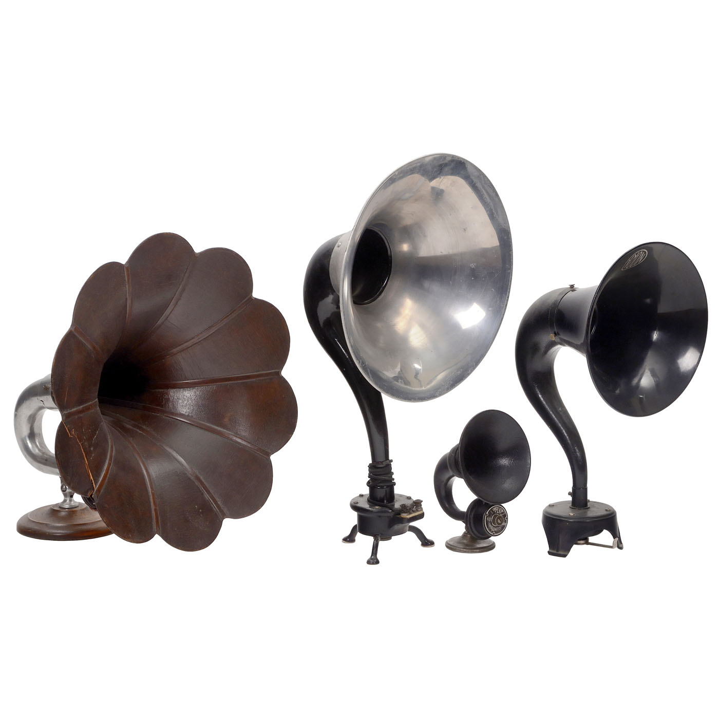 1) Amplion Concert AR-23, 1925, Alfred Graham. 2000 ohms, 10-piece oak horn (slightly damaged), Ø 19 in., system tested, working. - 2) Hezzanith Type 2B, c. 1925, Heath & Co., London, 2000 ohms, aluminum horn, Ø 14 in., system tested, working. - 3) Model L11, c. 1928, Nora, Berlin, 2000 ohms, Ø 10 in., bakelite base, system tested, working. - And: 4) Dragonfly AR102, c. 1925, Amplion, Alfred Graham & Co., London, 2500 ohms, miniature loudspeaker, Ø only 5 ½ in., system tested, working.