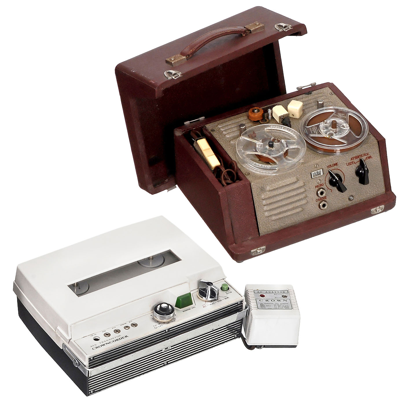 1) Uher 4200 Report Stereo IC, Germany, 4 tape speeds: 2.4 cm/s, 4.75 cm/s, 9.5 cm/s and 19.05 cm/s, 2 tape heads, all-metal case, with leather bag and carry-ing handle. - 2) JVC KD-2E, Japan, stereo cassette deck. - 3) Crown CTR-5400, Japan, reel-to-reel tape recorder, 2 tape speeds, for 5 in. reels, with power sup-ply and instructions in box. - 4) Seradict, France, Seravox, Paris, reel-to-reel tape recorder, 110-130 volts AC. - 5) Magnetophon 75, Germany, Telefunken, 4 tubes, 110-240 volts AC, for 6 in. reels. - And: 6) Sony TC 200, Japan, 4-track stereo tape recorder, speakers in two-piece lid, mains operation. - All untested.