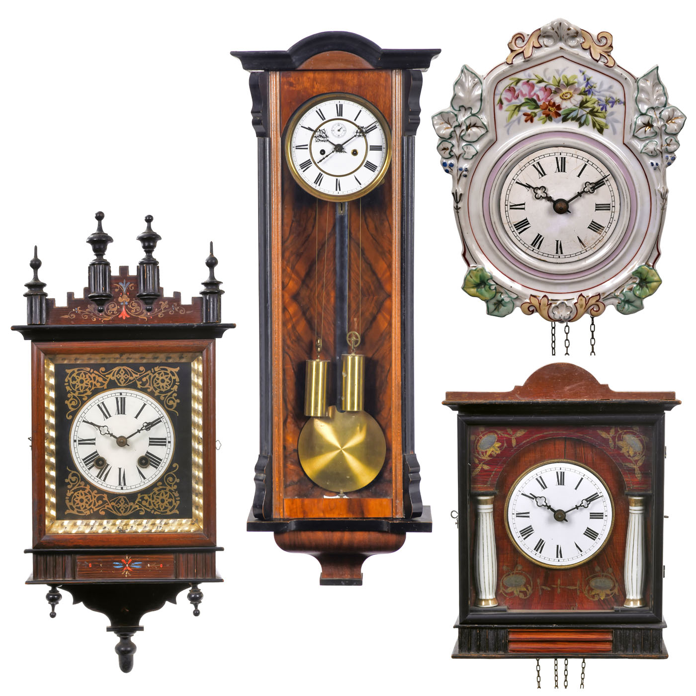 1) Biedermeier clock, c. 1860, Black Forest, enamel dial, Roman numerals, painted face with 2 porcelain half-columns, wood-plate movement, time-and-strike movement arranged side by side, half-hour strike on spiral gong, pull-string repetition, glazed pine case, with pendulum and 2 weights. - 2) Porcelain clock, c. 1870, Black Forest, enamel dial, Roman numerals, porcelain escutcheon, wood-plate movement, time-and-strike movements arranged side by side, half-hour strike on spiral gong, with pendulum and 2 pinecone weights. - 3) Picture frame clock, c. 1880, Black Forest, enamel dial, Roman numerals, face with gilt spandrels, wood-plate double-spring movement, half-hour strike on spiral gong, polished cherry wood case, complete, with pendulum. - And: 4) Viennese pendulum clock, c. 1890, two-train movement, two-part enameled dial with brass bezels, Roman numerals, subsidiary seconds dial, brass-plate movement, anchor escapement, half-hour strike on spiral gong, spring-suspended pendulum, weights with pulleys, dark-stained wood case, glazed front door, height 38 ½ in., complete with keys and weights. - All clocks working (without guarantee).